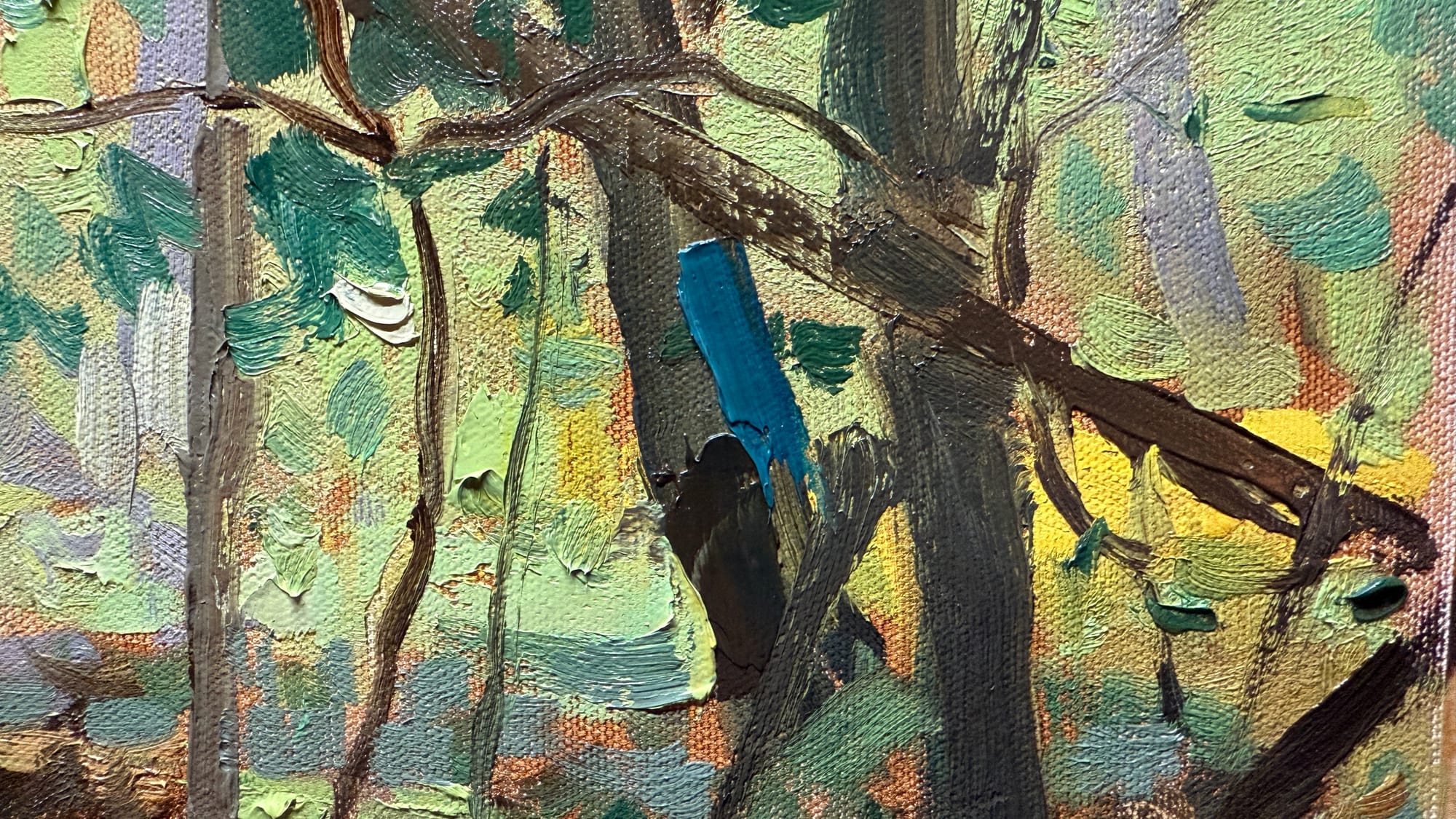 To be clear, I’m not at all unhappy with yesterday’s attempt at a path through the woods. And I had every intention of finishing the painting up today. But in yesterday’s communiqué, I wrote about the two different ways of approaching color in a painting - more of a working theory than a definite statement of fact. And I’ve approached paintings in both hypothetical ways before. But I got to thinking about it last night after I wrote about it. So instead of finishing the first painting like I said I was going to today, I did a second version, starting out with greys and browns, and building up to stronger, bolder colors where necessary. The effective opposite of yesterday’s painting.