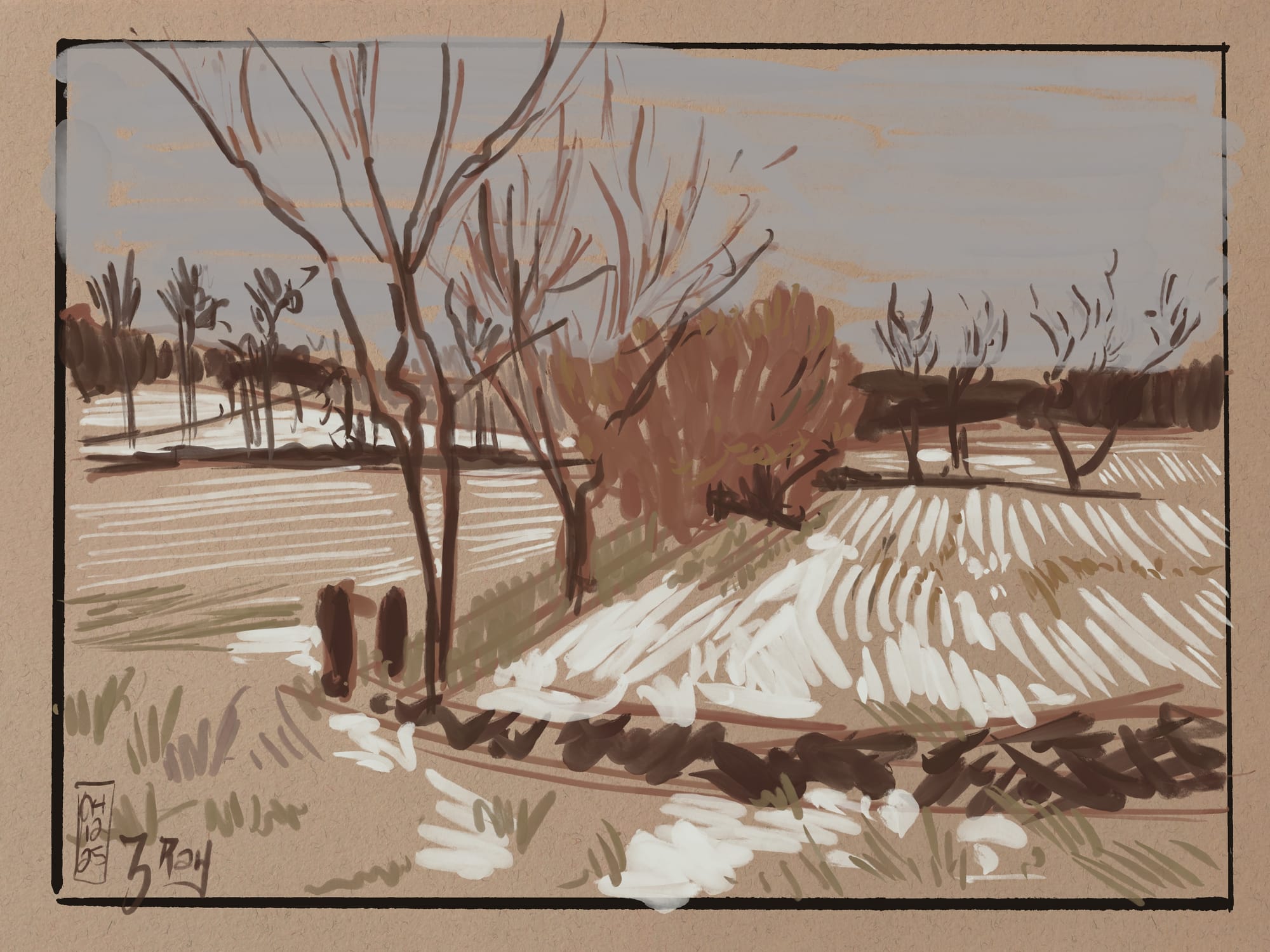 I also spent a bit of time on some landscapes this week. Early in the week, and in my only painting session this week, I worked on the second pass of a painting of my grandfather’s house. This painting session seemed largely to be one of more fully fleshing out the lighting effects in the painting, as the most visible changes in the painting came from adding the lit windows to the house itself. But refining the silhouettes of trees and the light post, and plopping in the warmer sunlight to the left of the house also really furthered the painting. Now it’s just a matter of waiting for the paint to dry over the next few weeks before I get to experiment with some glazing. My plan right now is to glaze a darker, more muted tone over the bottom half of the painting - all the grasses and foliage in the foreground. The second landscape was largely an exercise in trying to draw attention to a specific thing - in this case the zig-zag of the snow in the corn rows across the rolling fields. Cornfields always have such a beautiful linear quality to them once the corn has been harvested. I think it worked? It’s always such an interesting balancing act providing the context of the scene and trying to emphasize the thing in particular you were drawn to in the scene.