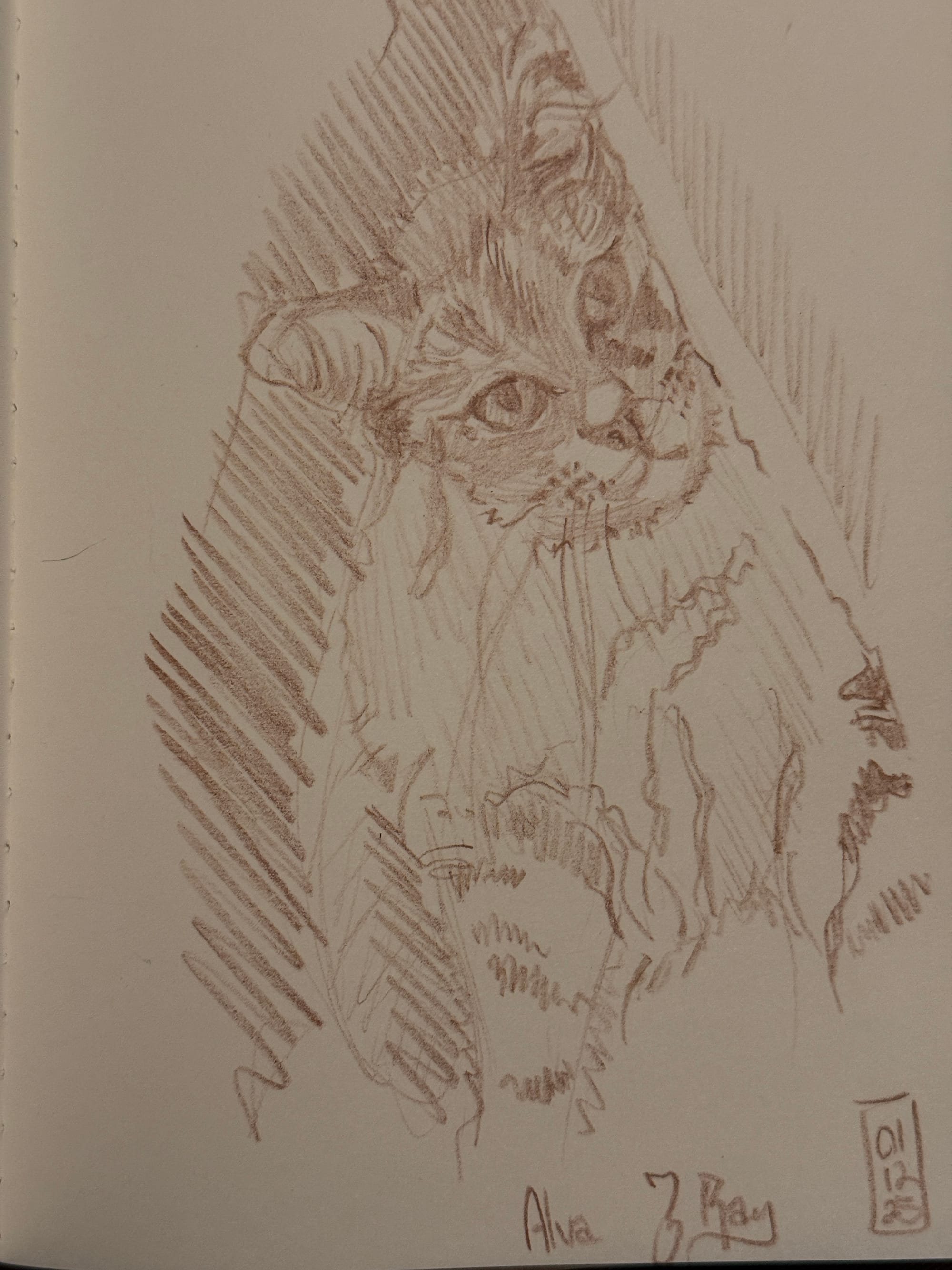 The first thing I’m seeing looking over this week’s body of work is cats. This week I ended up relying fairly heavily on some photos I took of our friend’s cats, as well as a really cute one of our cat, Alva. It was a pretty busy week in which I knew that I wasn’t going to get much painting done, and would be scrounging for time to get much creative work done. Next week is finals for the University, and the week after that is finals at the Academy, so I figured it might be time to get the gradebooks in order and make sure students were aware of the things they needed to be finishing over the next few weeks. All that boring admin stuff ate up a lot of time that otherwise would’ve gone towards painting. So sketching was the name of the game this week. Quicker to set up and clean up after than paint. And I could work from the couch after dinner while we watched something. I’m also starting to notice how challenging it is drawing cats. Well, drawing portraits of cats. It’s not so hard to make a drawing that looks like a cat, but it’s substantially harder to make a drawing that looks like a PARTICULAR cat. I’ve noticed this particularly with our cat, Alva. Trying to get the drawing to look like him specifically - his unique characteristics - is tough. I’ve gotten so used to sketching portraits of people that the specific problems of capturing their uniqueness have grown less novel. This is not to say that I create a likeness every time, just that the problems inherent in rendering humans are generally familiar to me now. So getting to re-discover these novel problems, similar as they are to other somewhat daily problems, has been fun. I do love a good visual challenge.