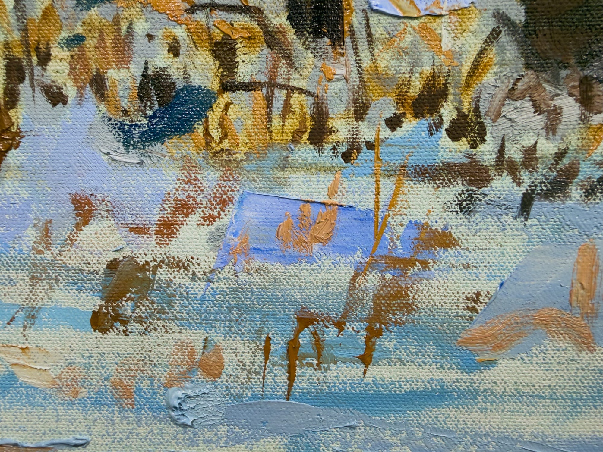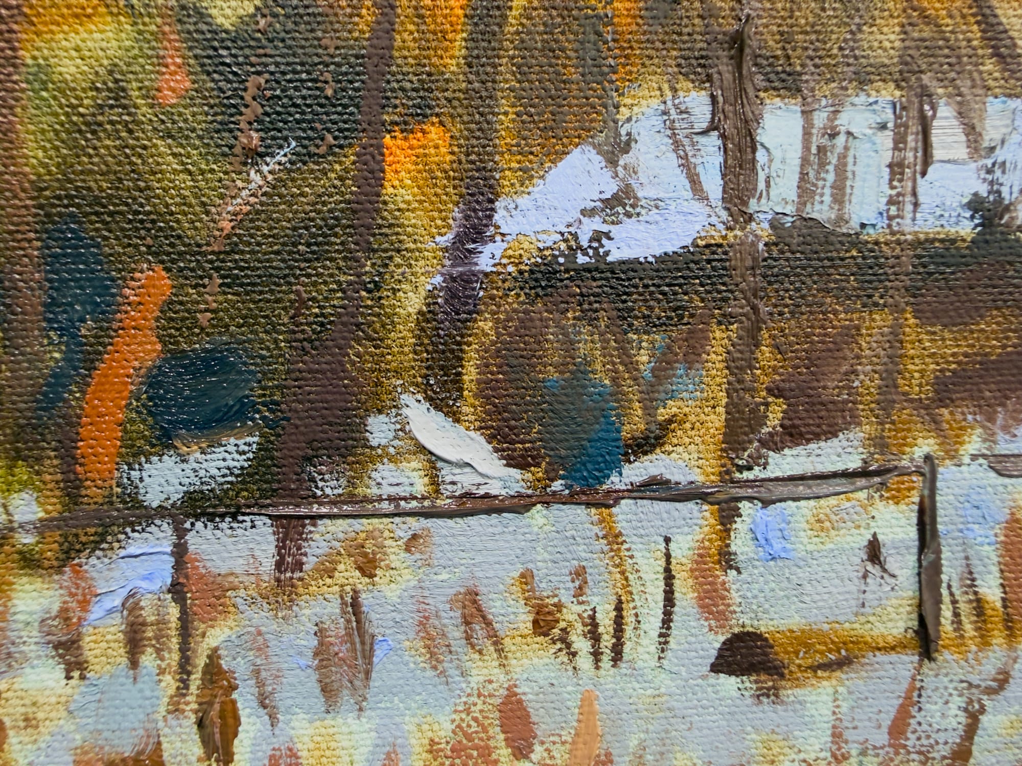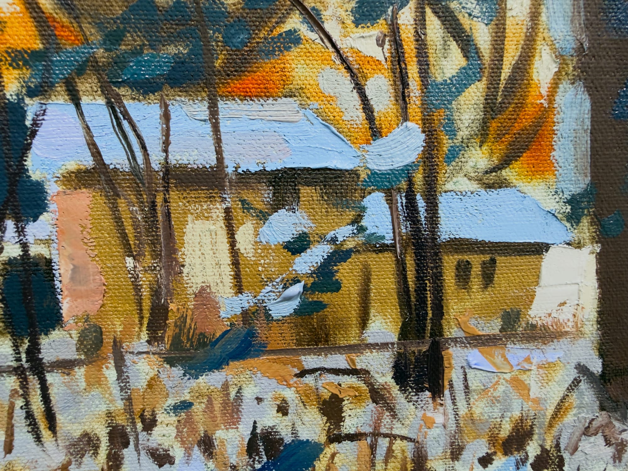 I'm either done with this painting or tired enough of it to stop working on it. My favorite adage about this part of the painting process states that paintings are never finished - only abandoned. So I'm abandoning this one, I think. I could always decide to start back up on it on Thursday, but that seems unlikely to me. I'm wanting to start something new. And I think the painting does what I wanted it to do. I feel the chilly winter morning when I look at this painting.