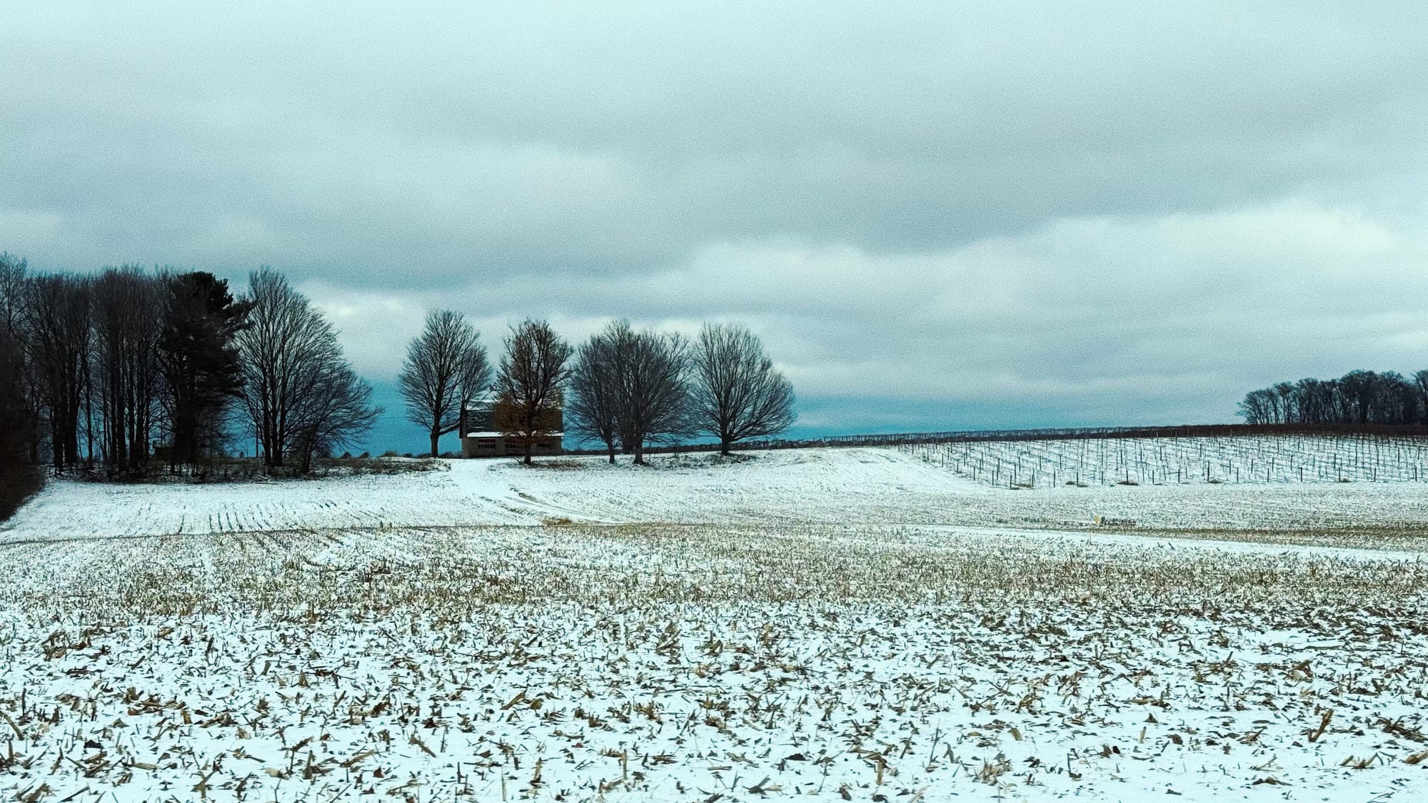 We drove past this old barn at the far end of a field again today, and I was reminded of a sketch I did of it earlier this year. That got me thinking it might be fun to do a digital color sketch of it this evening. I know I've mentioned this before but I love the fun lines that snowy cornfields make - the brown roughage of the cut stalks sticking out above the snow. They really do a good job of showing the dimension of the landscape. And the vineyard at the far right is a fun puzzle to figure out as well. Not too much detail, as it's right on the edge of the frame, but enough to get the concept across. It also helps funnel the viewer into the focal point of the barn and the bare trees near the center.