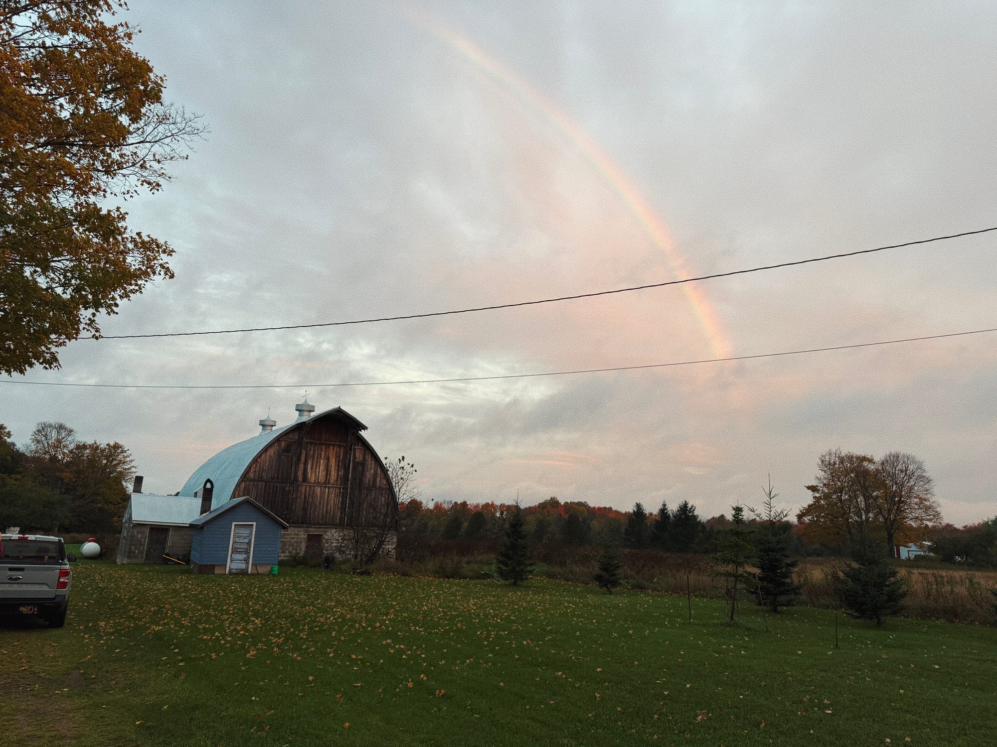 This morning as I was packing up to leave, I looked back over at the barn and then up at the sky, and saw this pretty neat rainbow. I took a few pictures, hoping they might capture the rainbow. I thought about trying to capture that rainbow in the sketchbook, but realized pretty quickly that trying to capture the chromatic hues of a rainbow in pencil might be a bit difficult… It is nice when I have those thoughts before I put in a moderate amount of work.