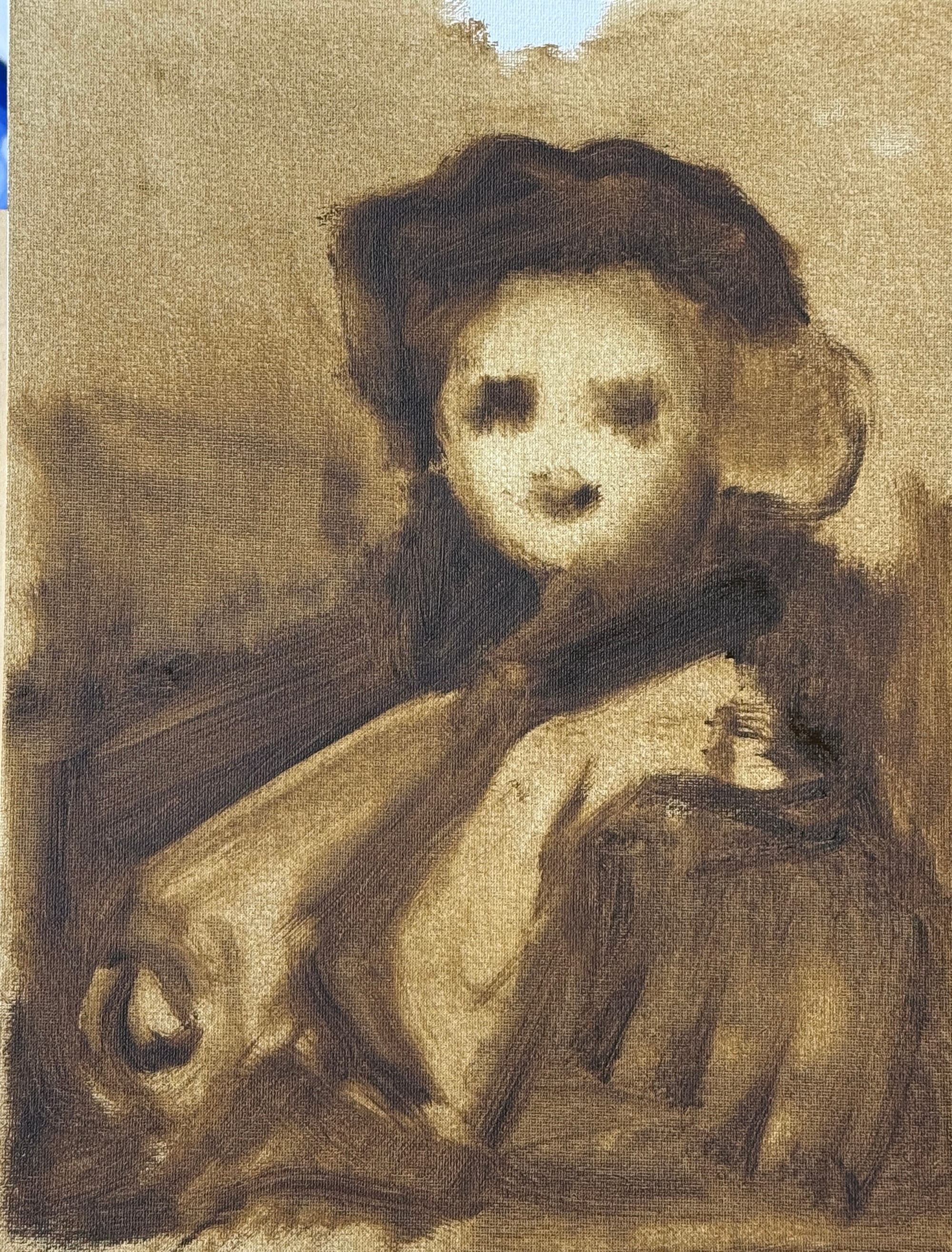 Today was my first day teaching Intro to Painting for the semester. The first project/exercise I always have students do is a Rembrandt self-portrait exercise, starting the first day in monochrome - just a single earth color brown so they get the hang of handling paint in it’s various stages of dilution without wrestling with a lot of colors. The second day is an introduction to a limited palette for the flesh tones, painted over top of the underpainting from the first day. By the end of day two, they have a passable rendition, and a working knowledge of one way to create a painting from start to finish. I did a demo for them, showing what to do, and then started another painted sketch while they worked on their Rembrandt underpaintings. Above is my second sketch. Below is my demo.