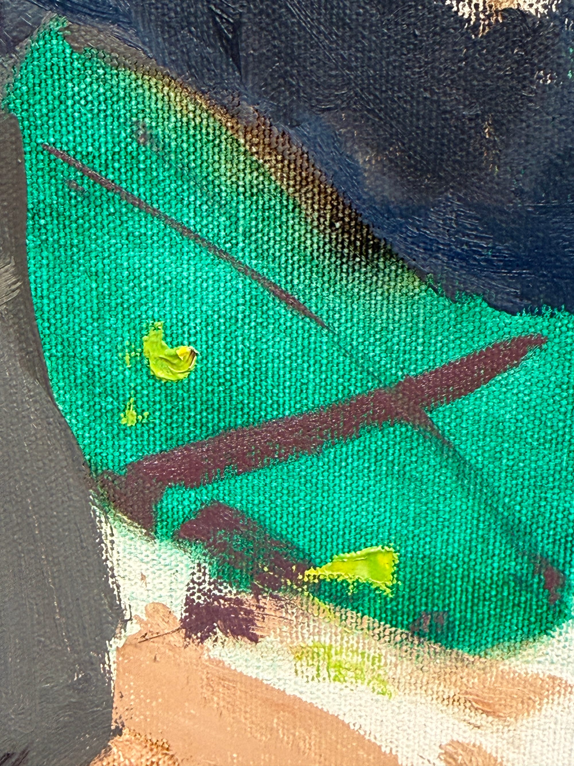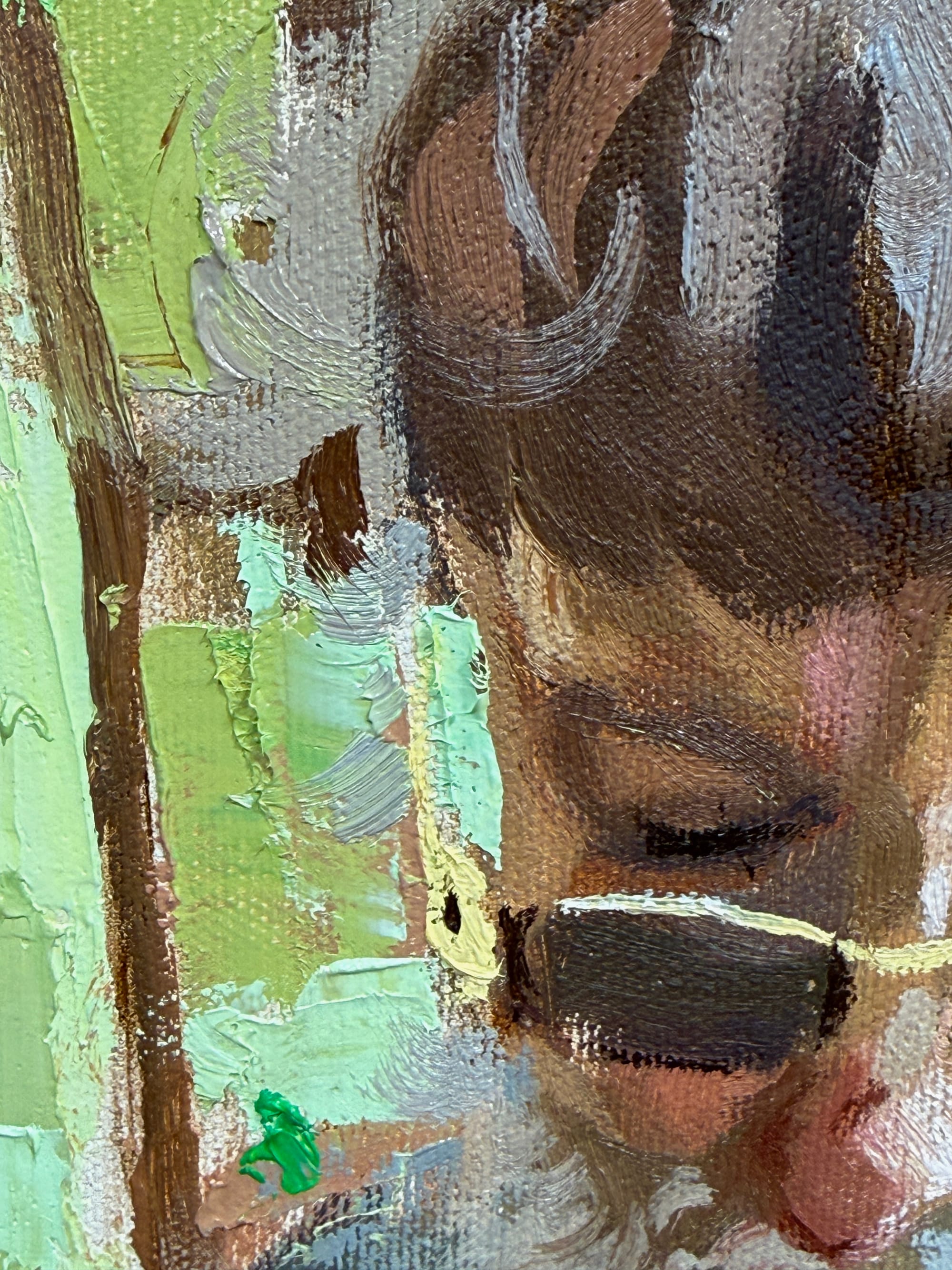I'm getting closer to finishing this one. Bit by bit. I think it was another "just chip away at it" sorta day. Adding brushwork to the emerging tapestry of the painting. I'm starting to figure out the shoreline and background on the right side, and that's definitely progress. Not so much visible progress, but you gotta start somewhere. Another pass on the face has helped the likeness too. Overall aspects of the painting are starting to tighten up. Obvious mistakes are getting corrected and helping reveal other mistakes. Things are getting more refined. Tomorrow I'll hop back to the Hannah/Alva painting. It's nice to have two paintings to jump between - it helps to not get burned out.