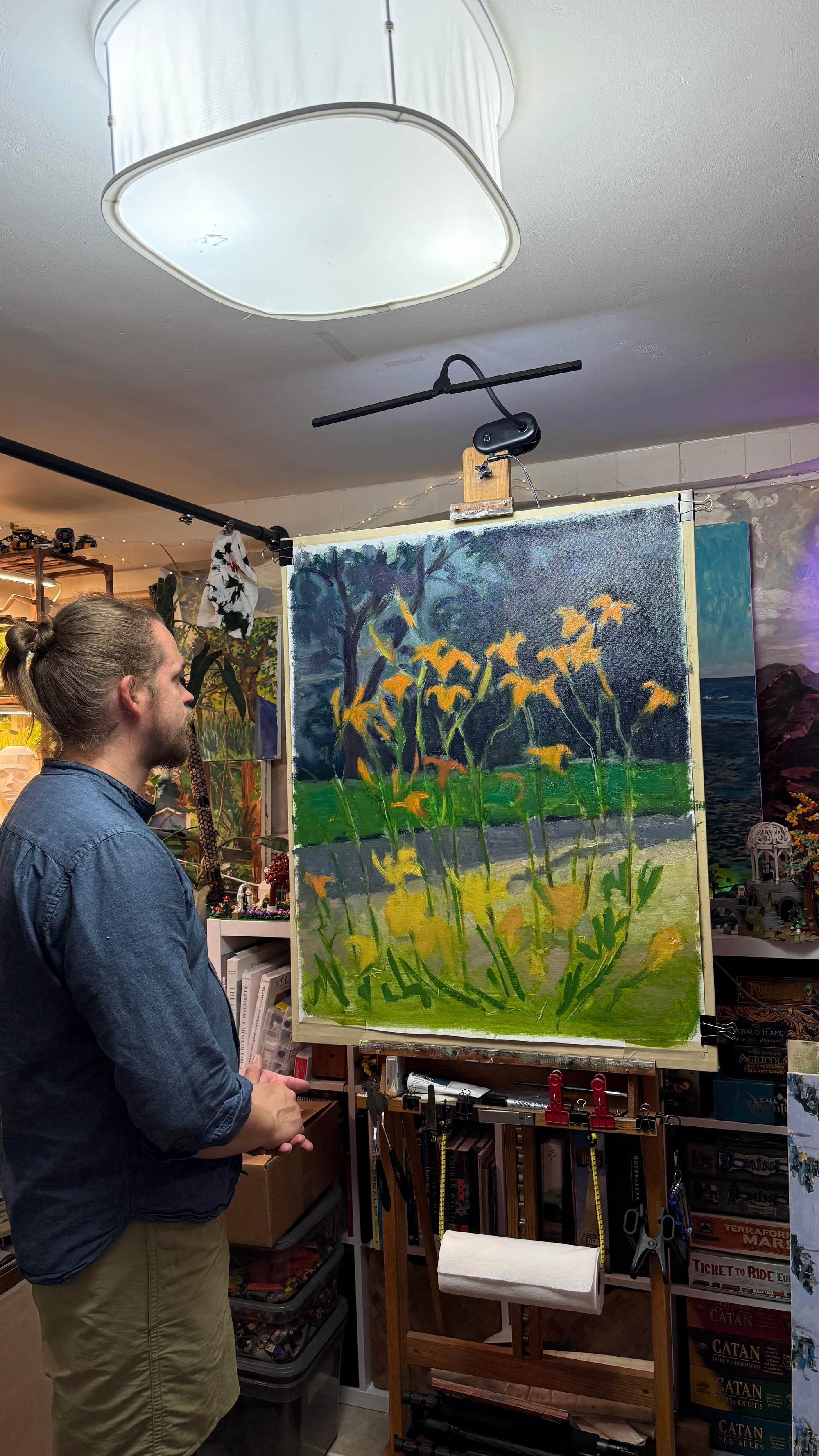 The painting on the easel, artist for scale. And the reference. I’ve changed the orientation, as I wanted a tall portrait oriented painting, and have pulled out a few clusters of lilies to accommodate the slimmer composition.