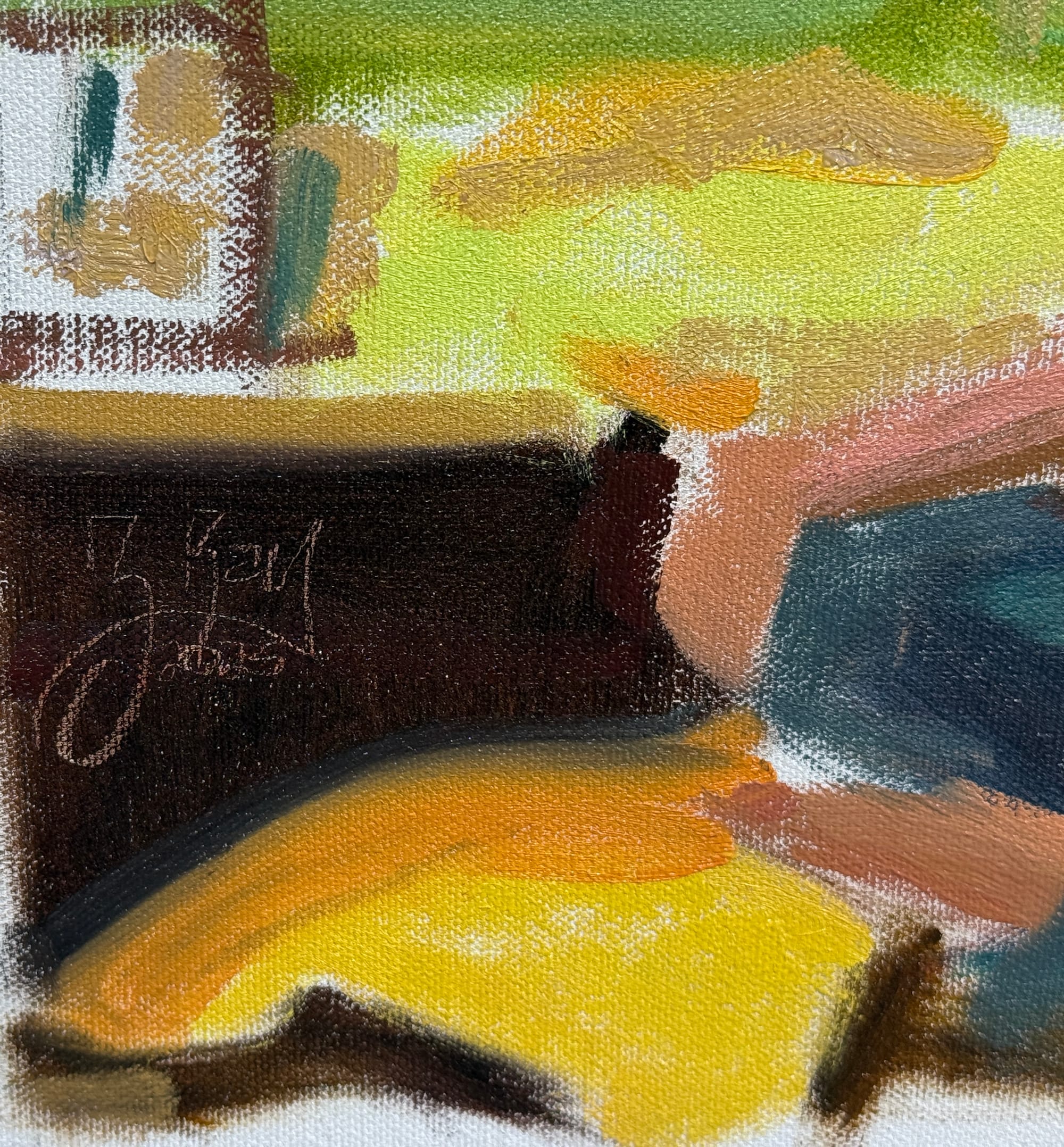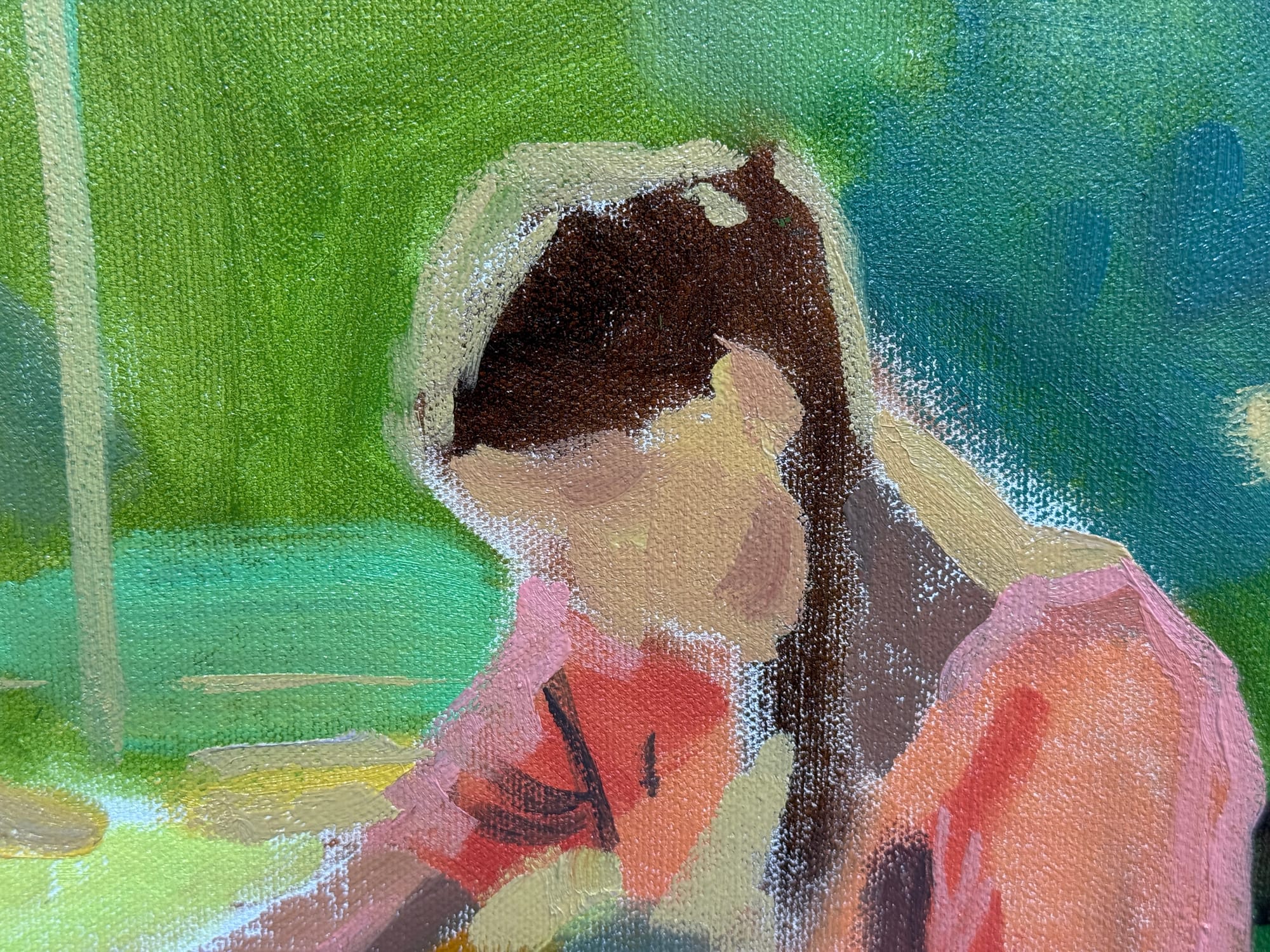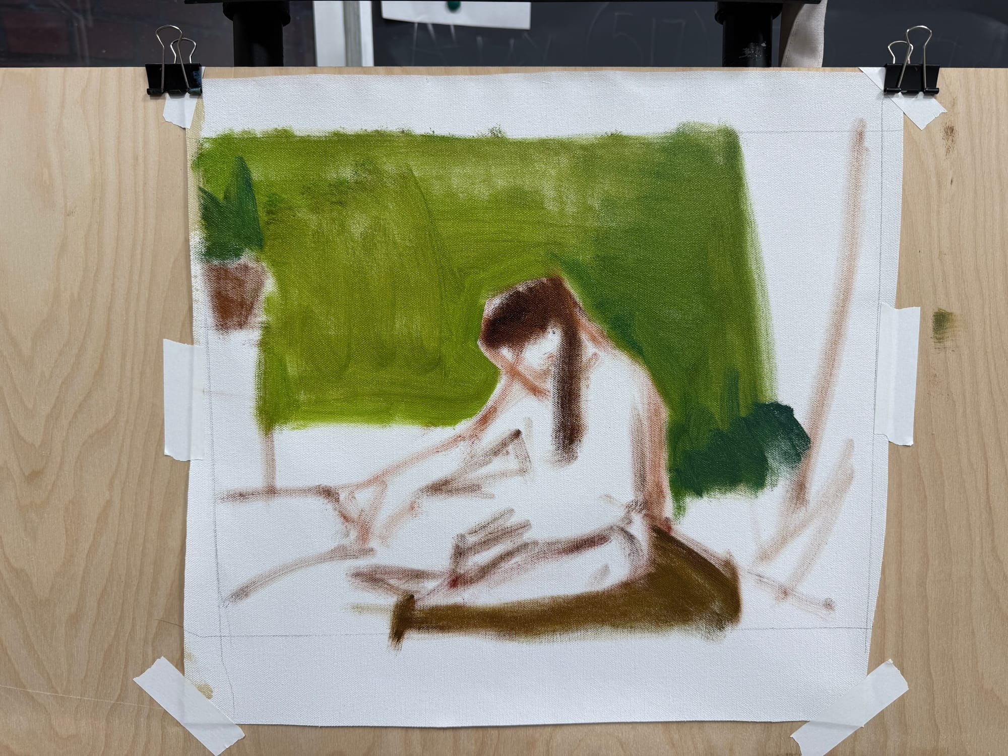 I got the first layer of paint down on the compositional drawing of Hannah and Alva from yesterday. I’m doing this one a bit smaller than I’ve ordinarily done these - it’s a 12”x16” painting. I remember reading somewhere that the smaller the painting is, the more you can get away with pushing your colors brighter and more saturated, and I have this image in my head of this being a really colorful painting. So smaller made more sense to me today.
