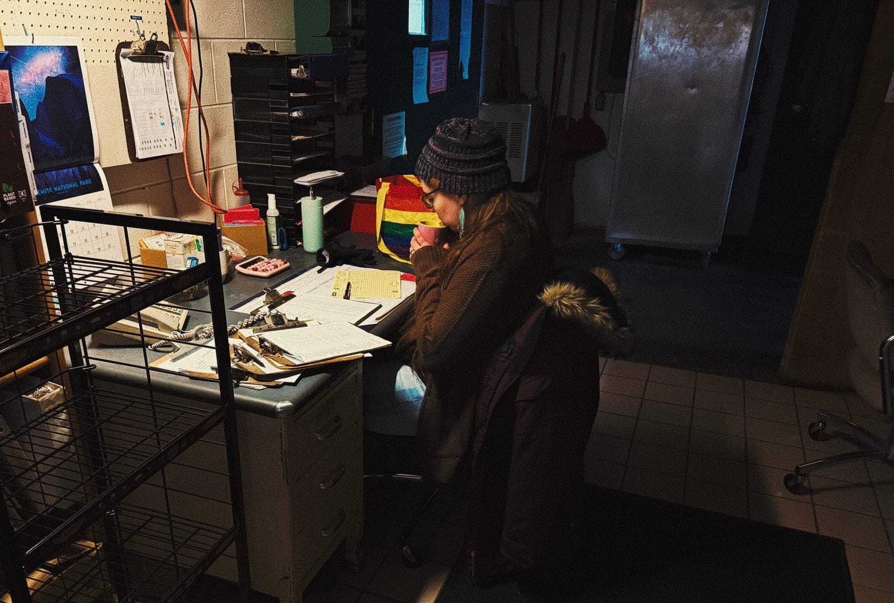 I snapped this picture of Hannah at work today - I absolutely loved the feel of the light spilling out onto her desk, and her pose with the mug of tea up to her mouth. This sketch doesn't do justice to the lighting effect so much, but it does get the "drawing" down. Just getting objects into the general right place. Next step would be a color/value sketch, which is where the lighting effect would really shine. Perhaps that will be tomorrow's project.