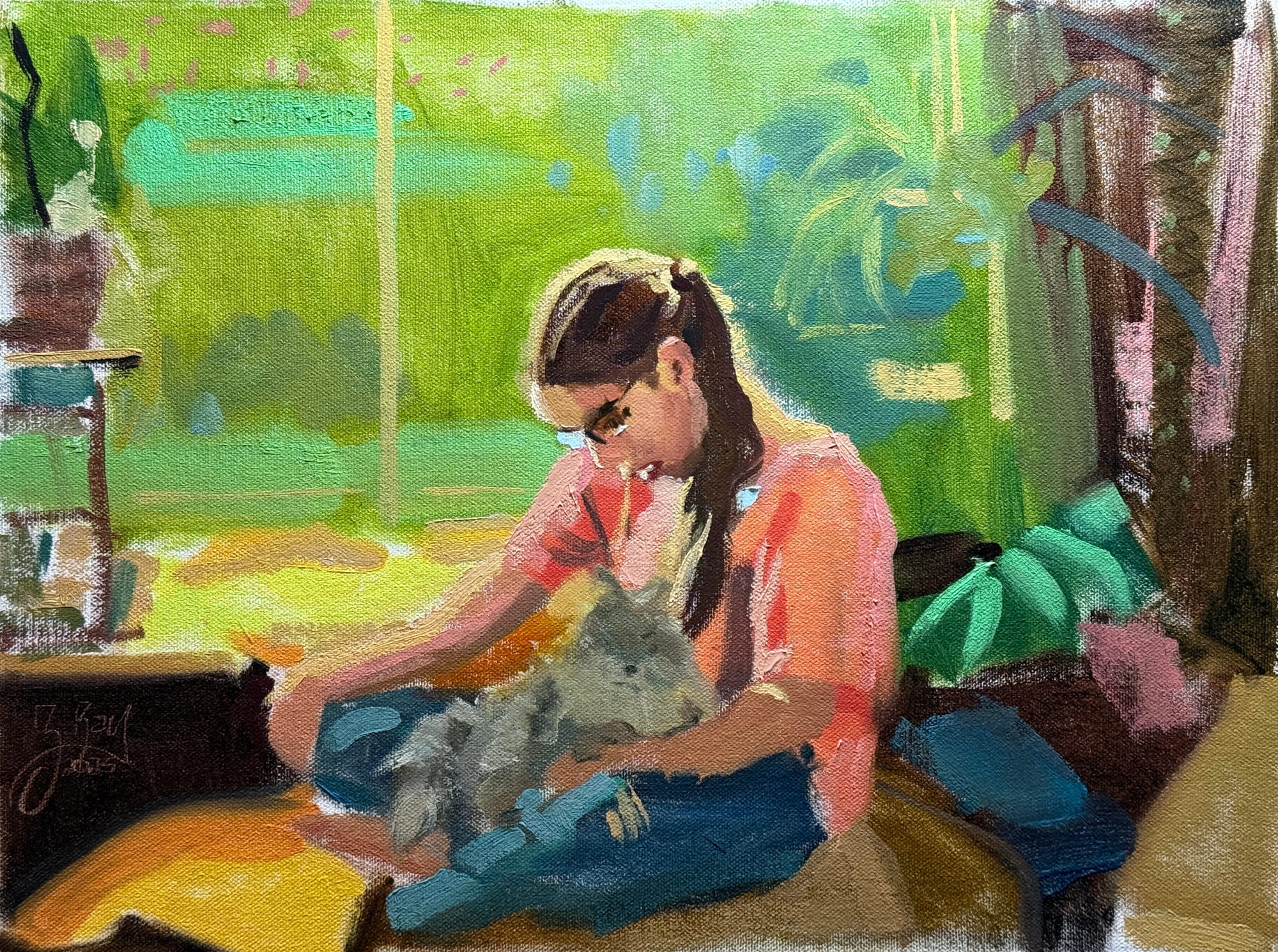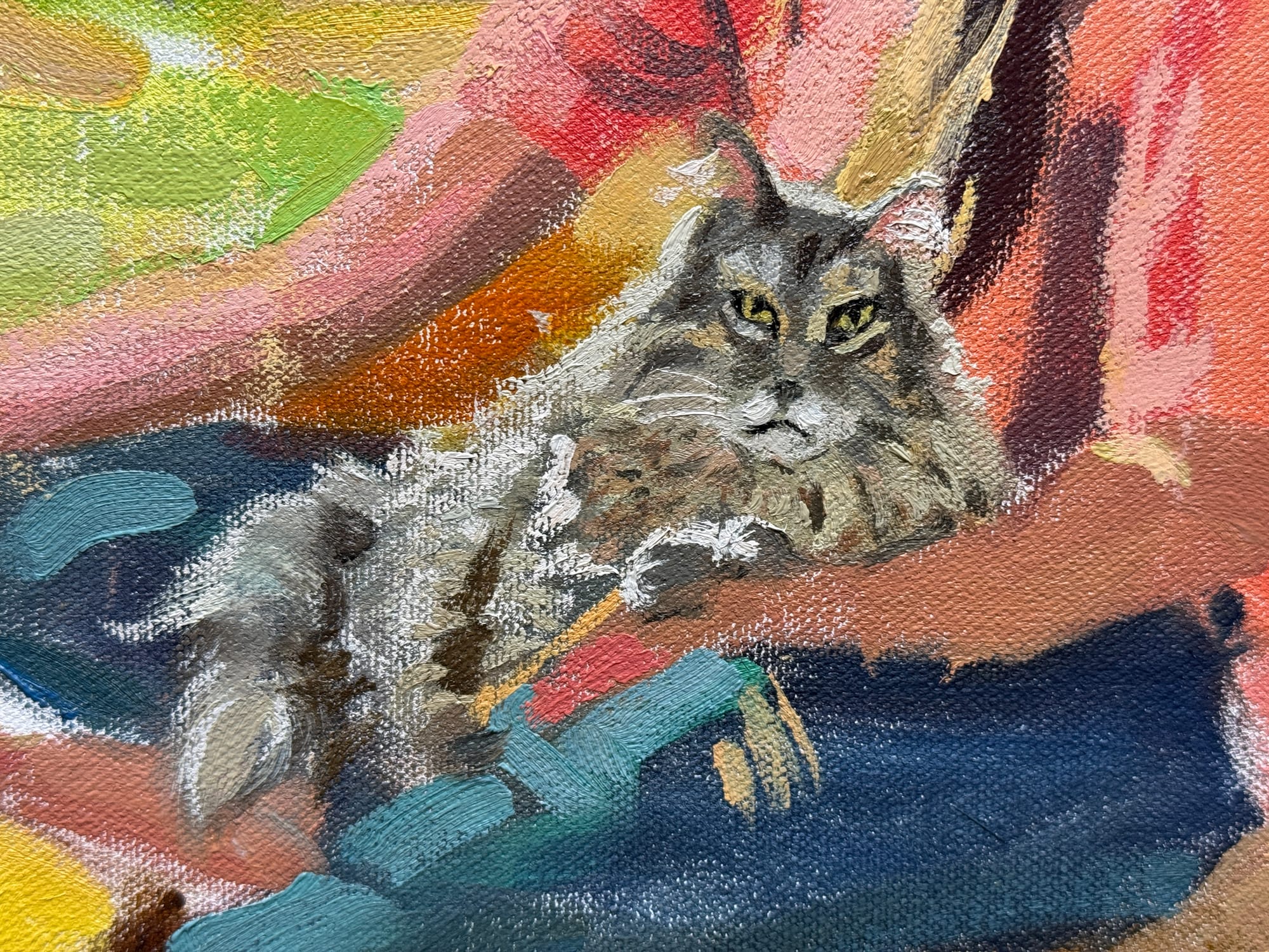 Small. I hate painting small. It's not that the painting is small, so much as that there are some very small details that I'm working on currently. I spent today working on the second pass for Alva, our cat. It's a second pass and not a final pass because I'm getting closer, but haven't nailed the likeness yet. What today boiled down to is a lot of fiddly little brushwork. I hate fiddly little brushwork. Loose medium sized brushwork or chunky big brushwork are much more my speed. But the concept on this one was to make a smaller, gemlike painting. I like how it's going, but boy do I hate fiddly little brushwork paintings.