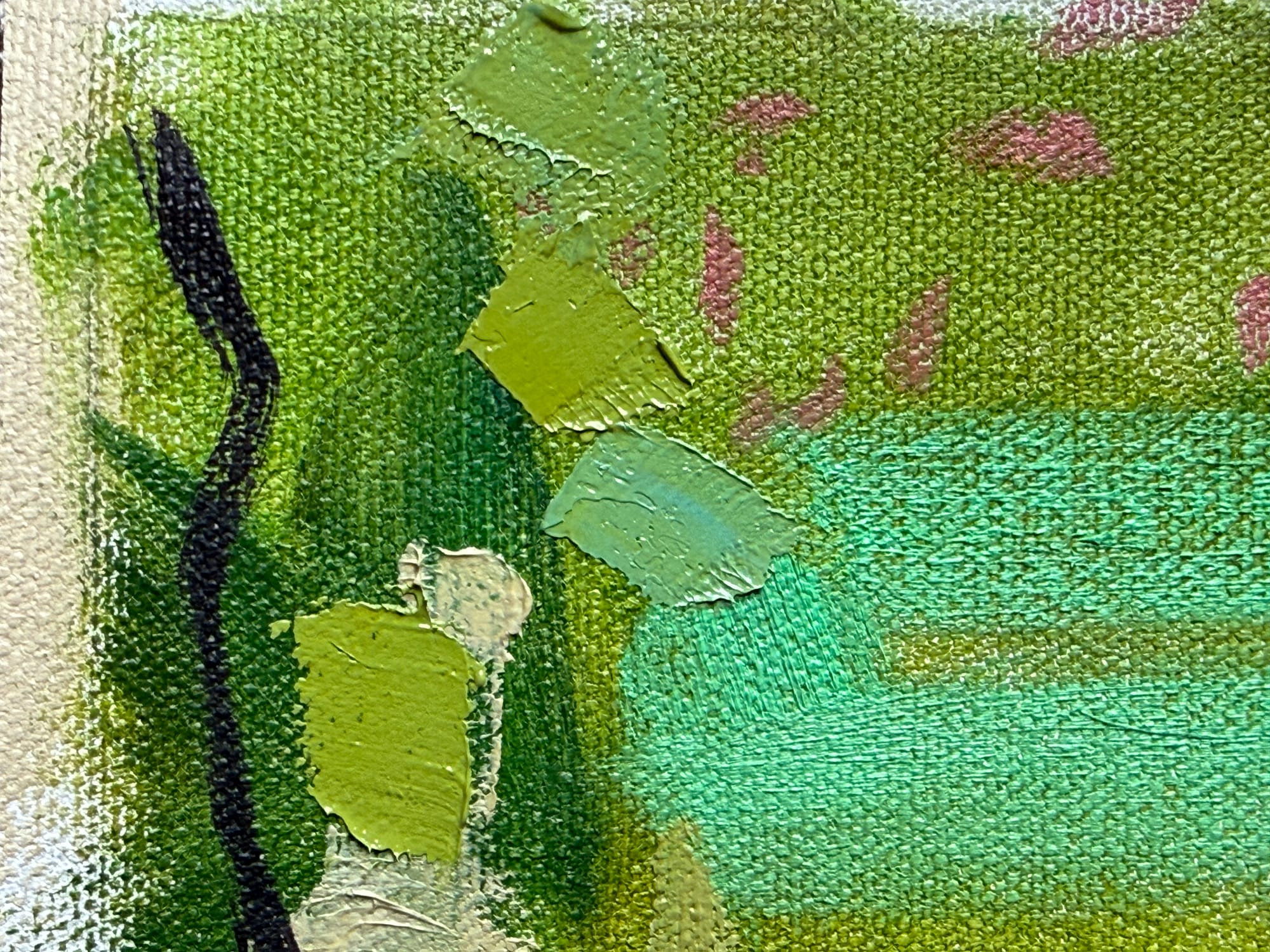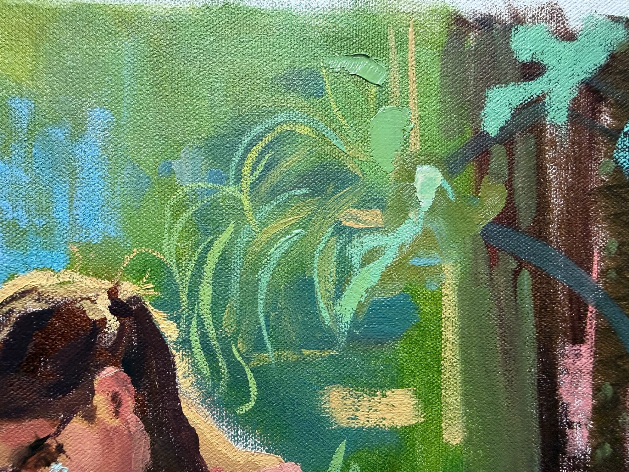 I also did some general futzing with some other background elements as well - just laying in some colors and general shapes - especially around the edges of the painting. That fun medium-sized brushwork. I'm planning for most of the detail and delicate brushwork to be focused on Hannah and Alva, with the detail falling off towards the edges. A bit like how human vision works - detail falls off very quickly from the center of focus and gets pretty blurry towards the peripherals.