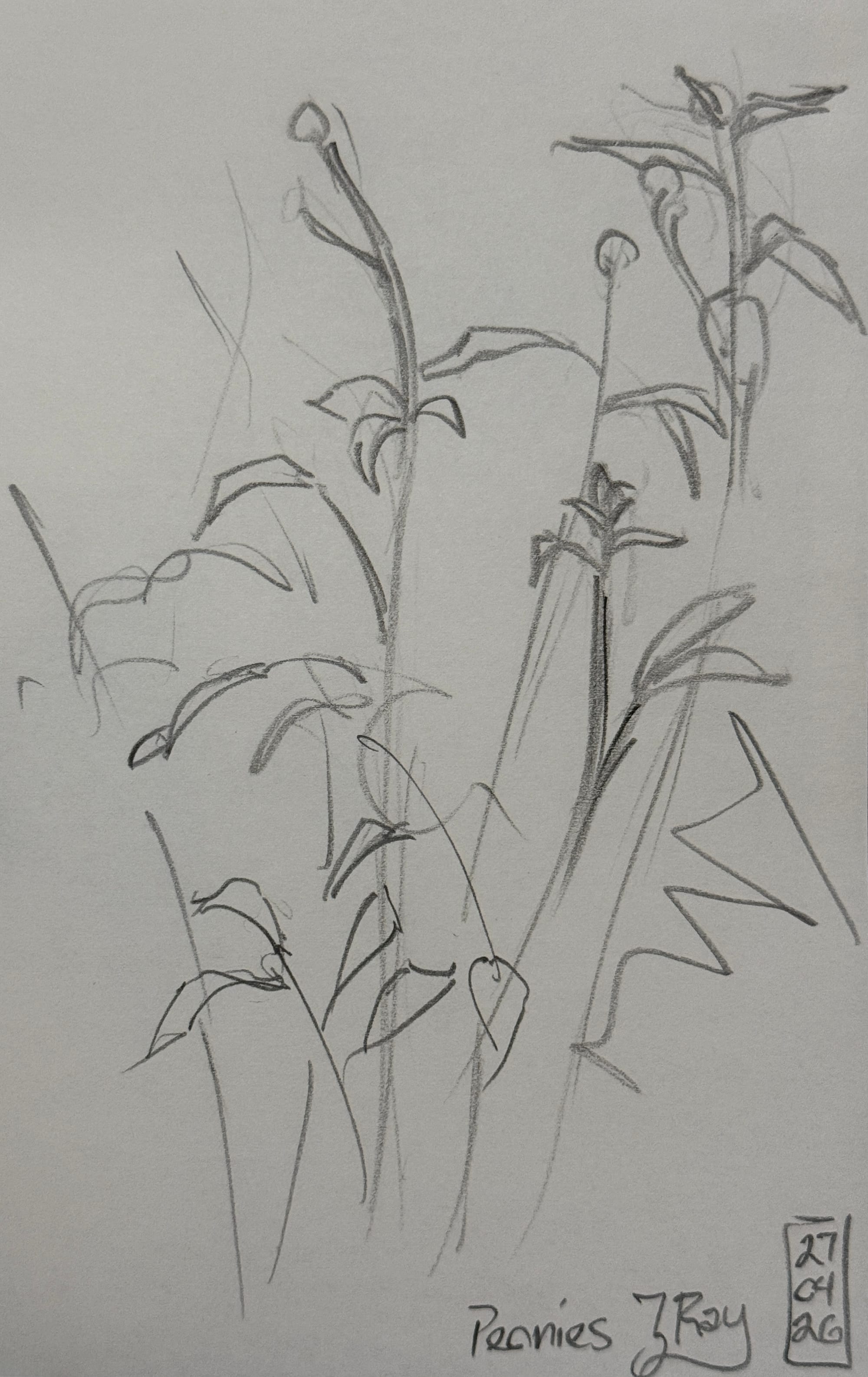 I also worked on another sketch of the Peonies - this time at the stage they're at right now out in the garden. I took the photo yesterday. I love how upright they are right now. I know they'll droop as the peony heads grow bigger and weight the stalks down. But I'm loving watching them this year. I'm gonna try to keep an eye on them, and see how they evolve this spring.