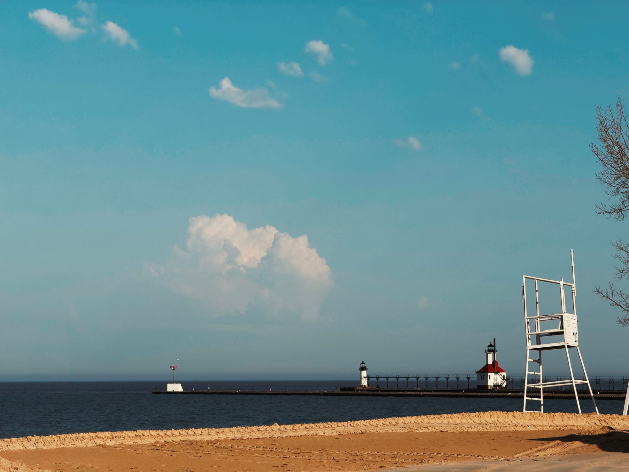 Earlier this past week I found myself in downtown St. Joe waiting while Hannah was in a meeting. I took a stroll down to the pier to see what the beachfront was like. There were some big bulldozers clearing sand from parking lots and beaches - getting the beach ready for the warm season. I really liked the stacking of successively larger visual elements, and love the juxtaposition of actually big vs actually smaller objects at different levels of visual depth. It's a fun visual puzzle to think through. It made it a fun sketch to try, though I think I could've done a bit better on the perspective for the pier channel. It makes the square lighthouse feel a bit out of place.