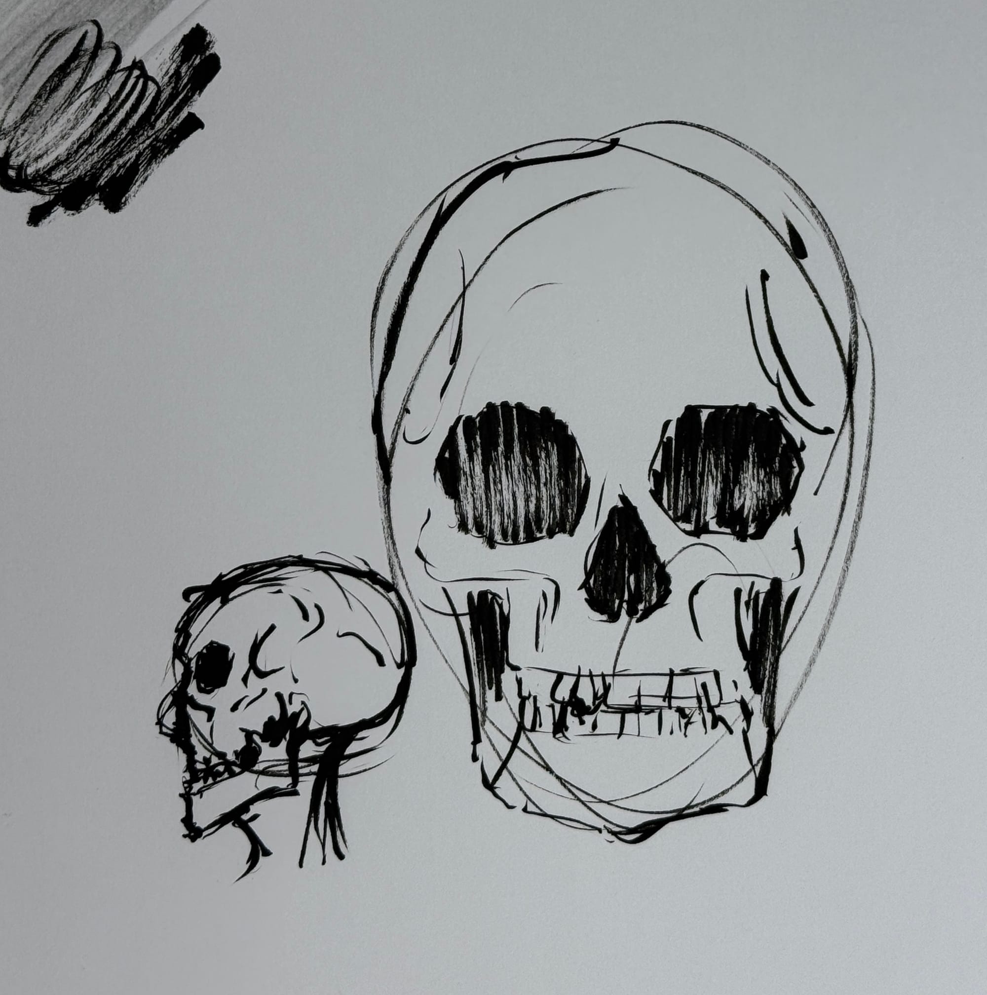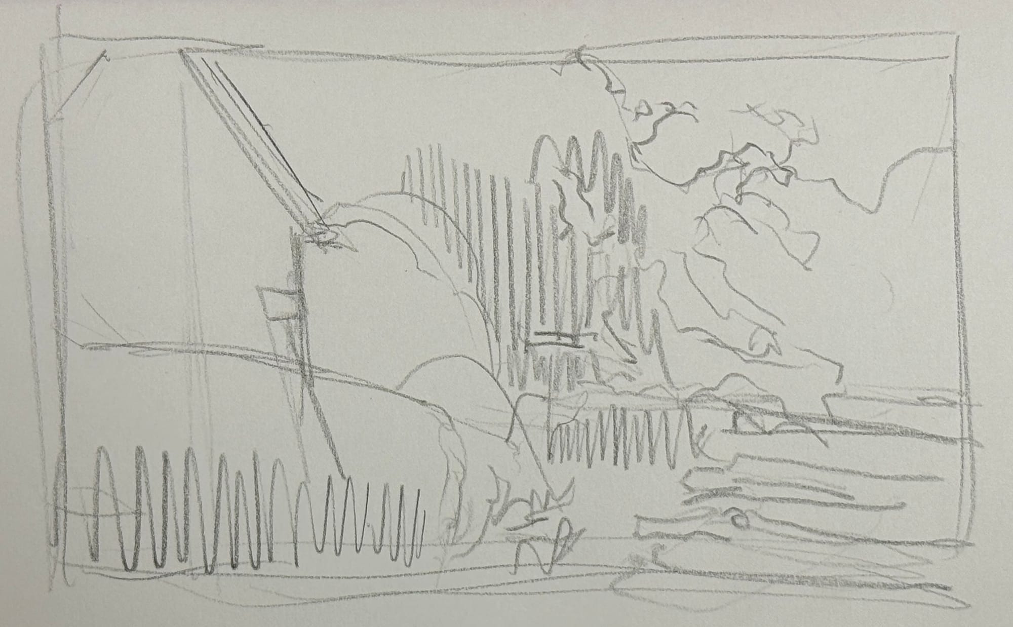 It’s been a truly exhausting week, and today was no exception to that. I did, however, get a decent amount of creative stuff done today. I did a quick compositional sketch for the painting you see above in my sketchbook, followed by a few brush-pen sketches from memory of some of my favorite subjects to draw - a skull (great for learning head proportions and facial features) and lilies. Then, once I got home, I worked on this smaller sketchy painting of up north while we were up there this summer.
