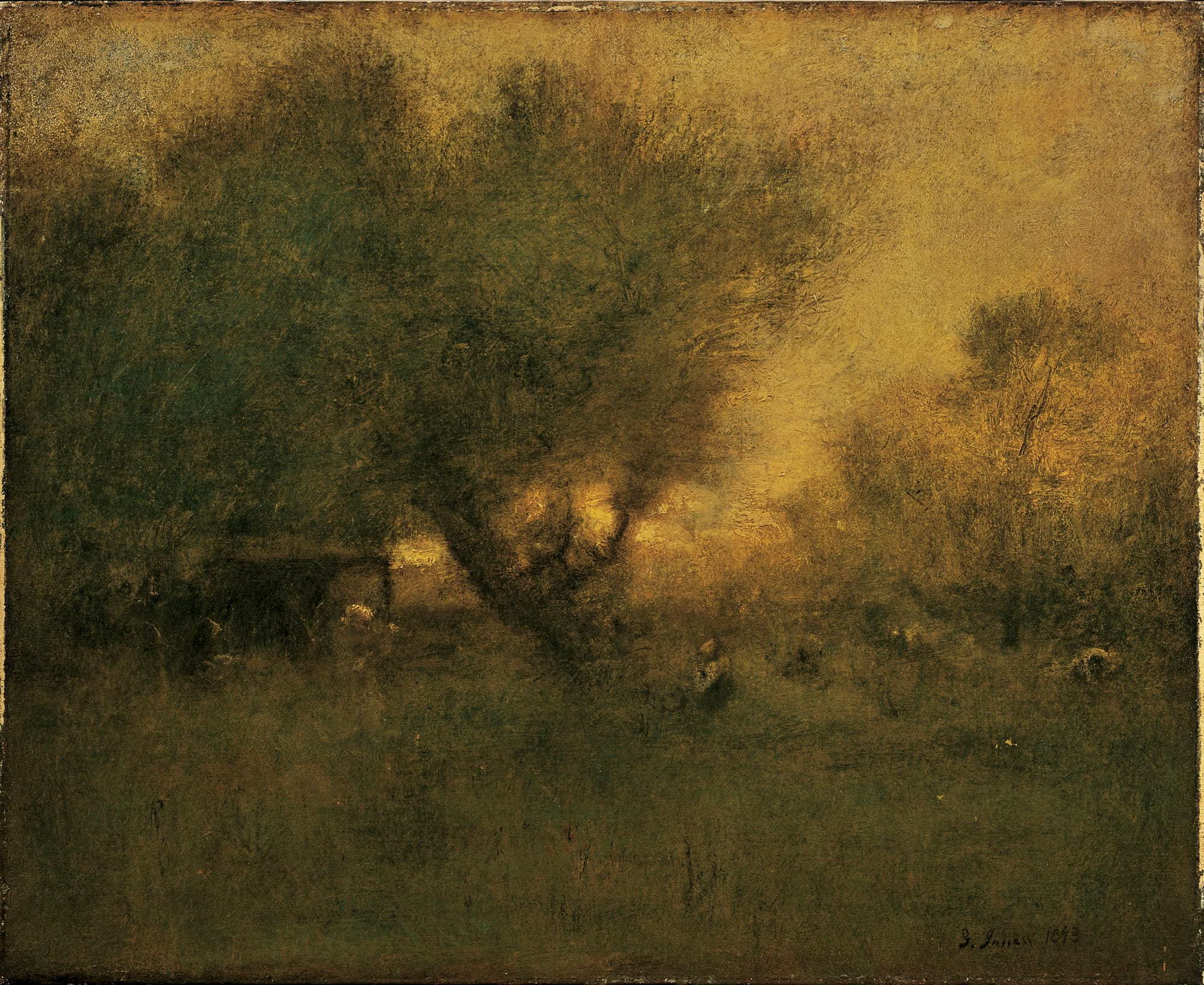We’re doing master copies in my Intro to Painting class right now, and I like to paint during class alongside my students. So I waited until they had all picked paintings from the list I’d given them, and chose one of the unchosen paintings to do a master copy of myself. This is a painting by George Inness called “In The Gloaming”. I really like the moodiness of Inness paintings, and the fact that many of his paintings have approximately no hard/sharp edges in them. Everything is soft gentle transitions between masses. There’s also a great deal of texture within the large color and value shapes of the painting. So I got my first pass on this painting finished, and it should be dry enough by next Monday at classtime to do a second pass, and build up that fun texture. Until then I’ll have to find something else to paint.