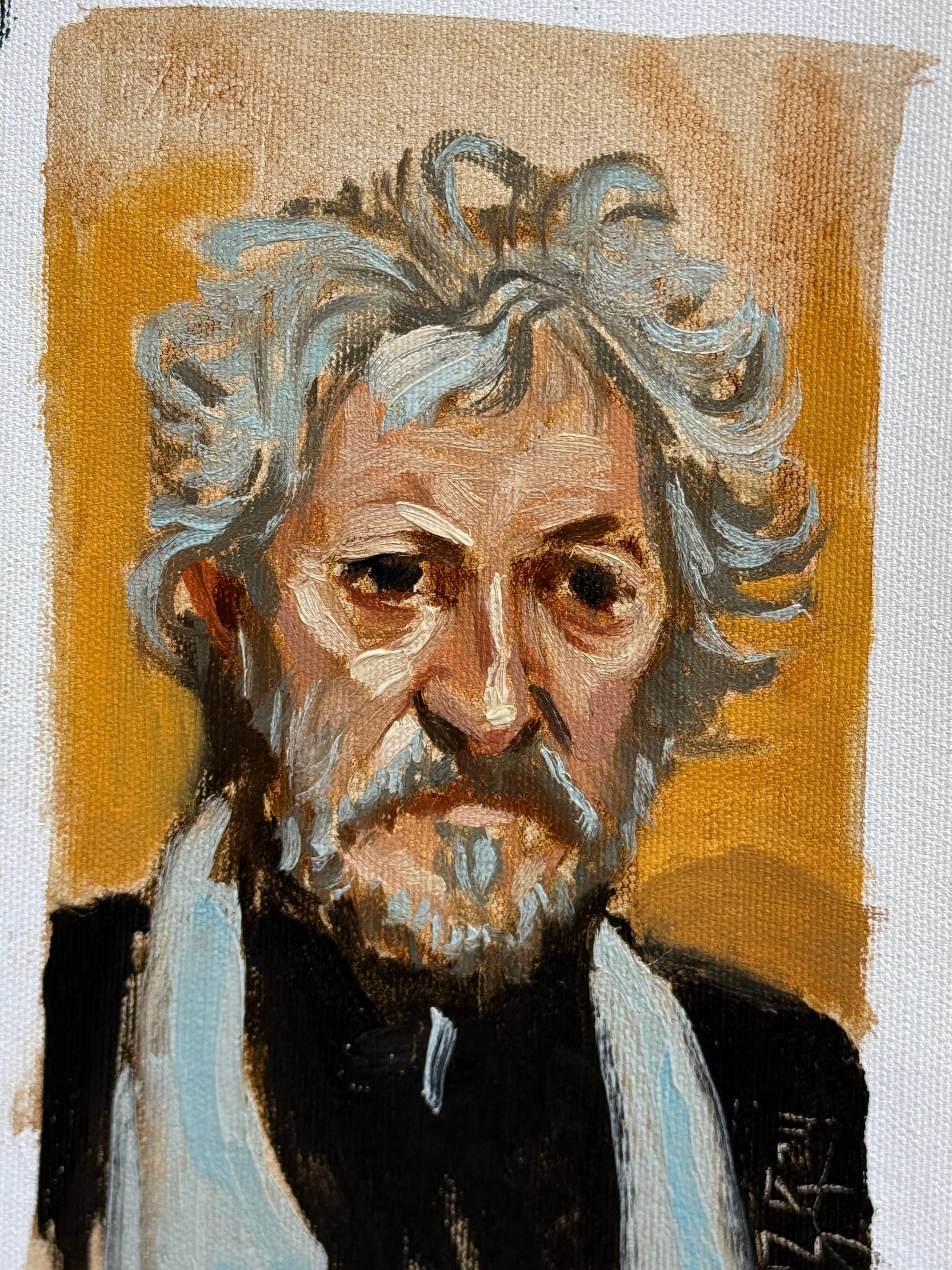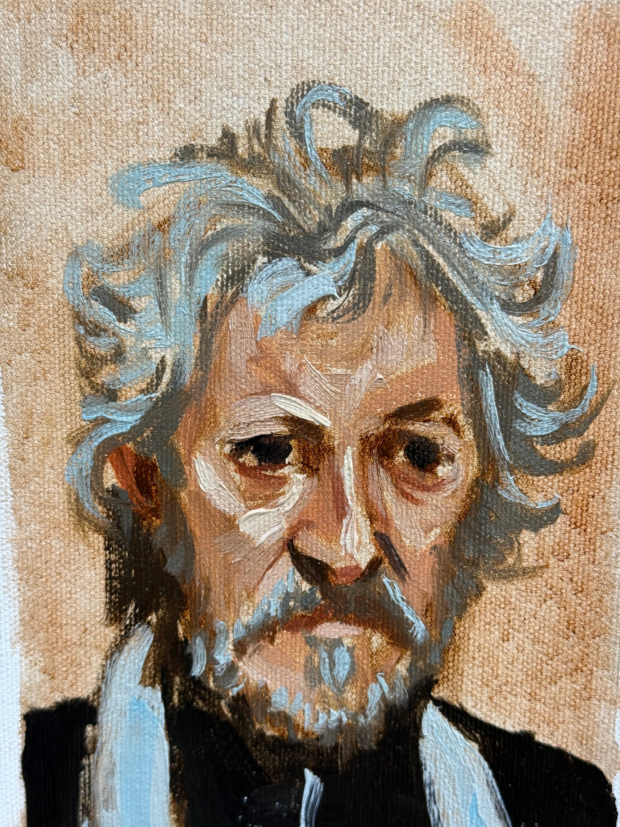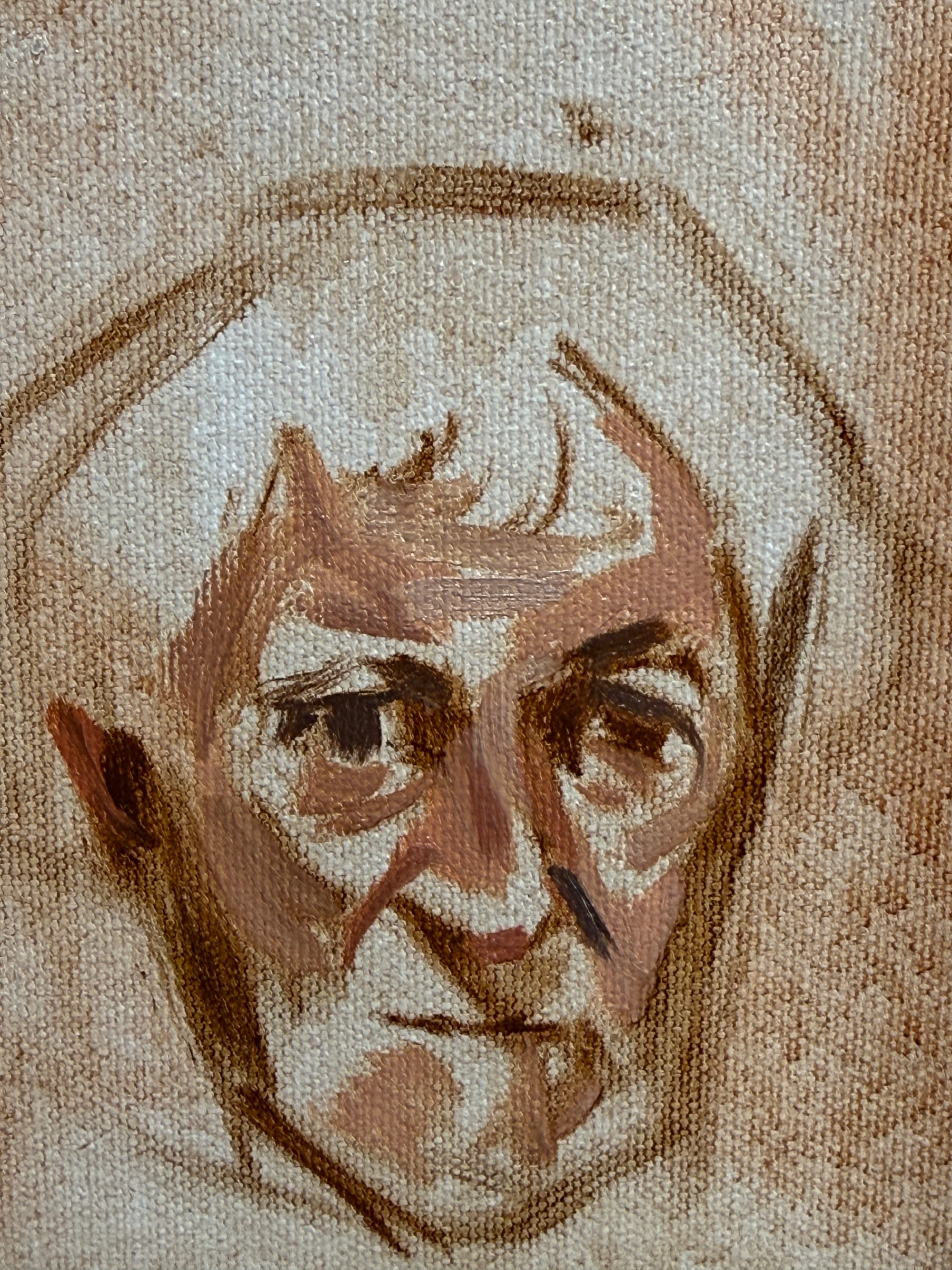 Another oil portrait sketch, done during class time today. With this one, I was just messing around and trying to ”draw” with the paint - painting in shorter lines of color. This is probably most evident in the gentleman’s hair, but I mostly used the technique throughout the face. Below are a few process shots that I hope will illustrate the point somewhat.
