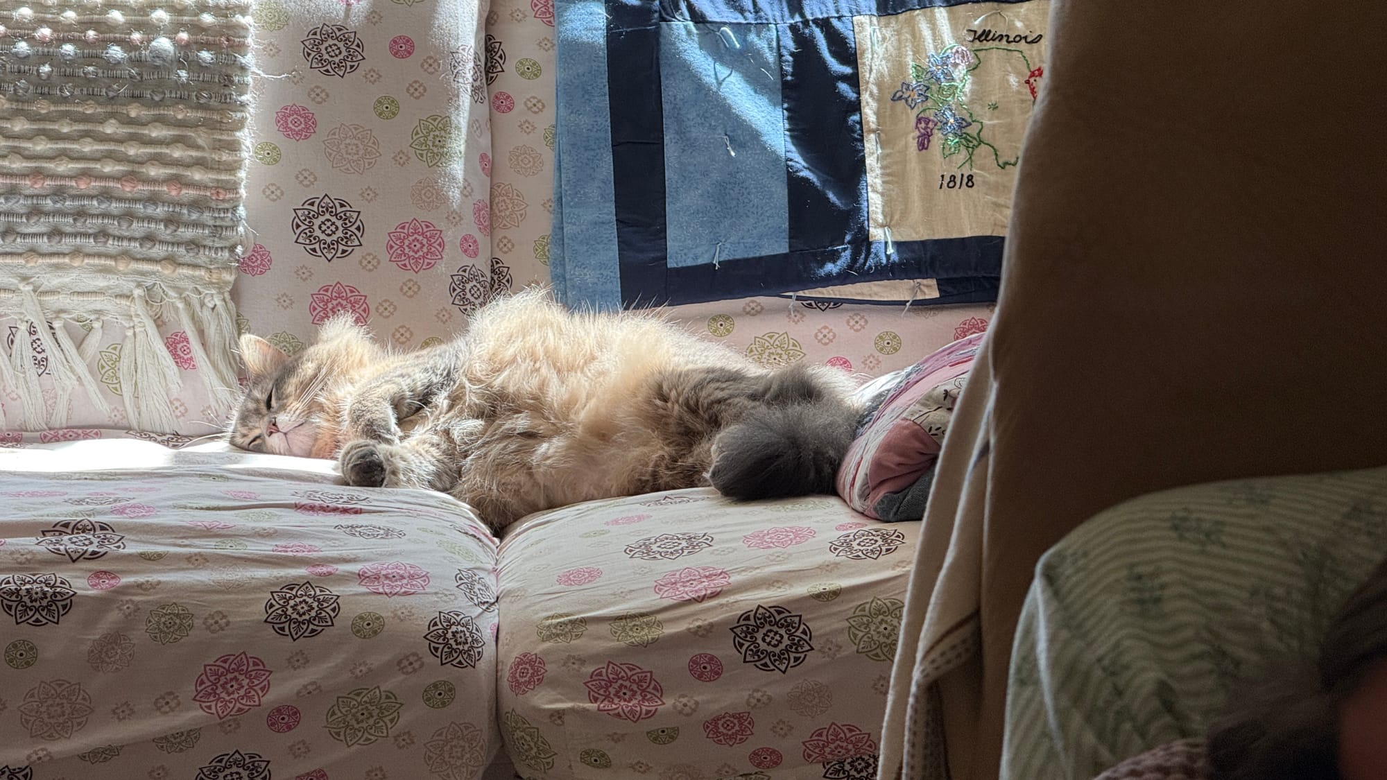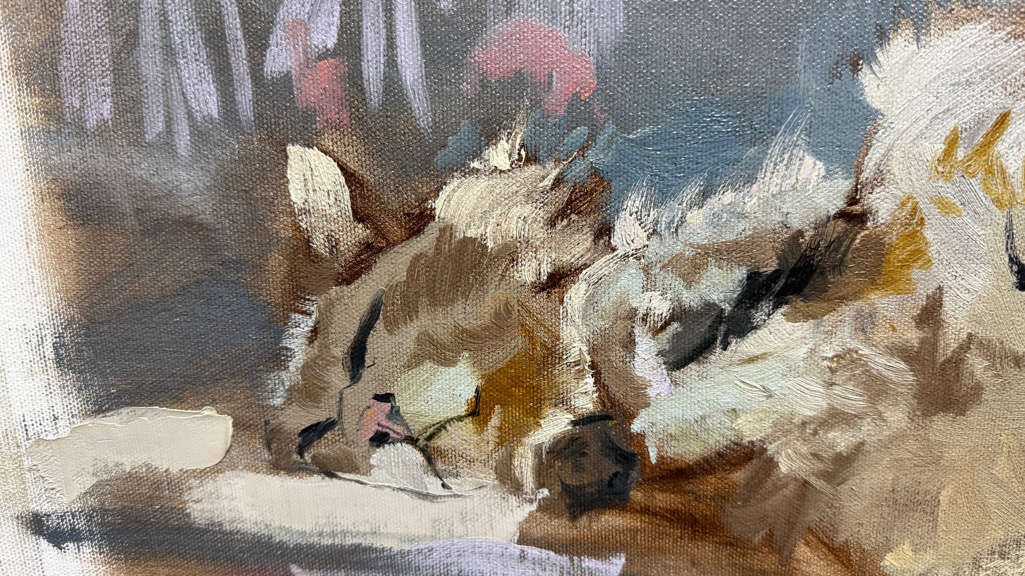 Alva was sleeping in just the right position today, and I’ve been wanting to do a painting of him for a while. But I also know Alva, and the minute I get out the paints, or even look at him for more than a minute, he’ll get up and leave, just out of kitty obstinance. So I snapped a few pictures of him very quickly before his kitty senses sensed me watching him. It’s a good start. Hopefully that good start energy continues into the rest of the painting.