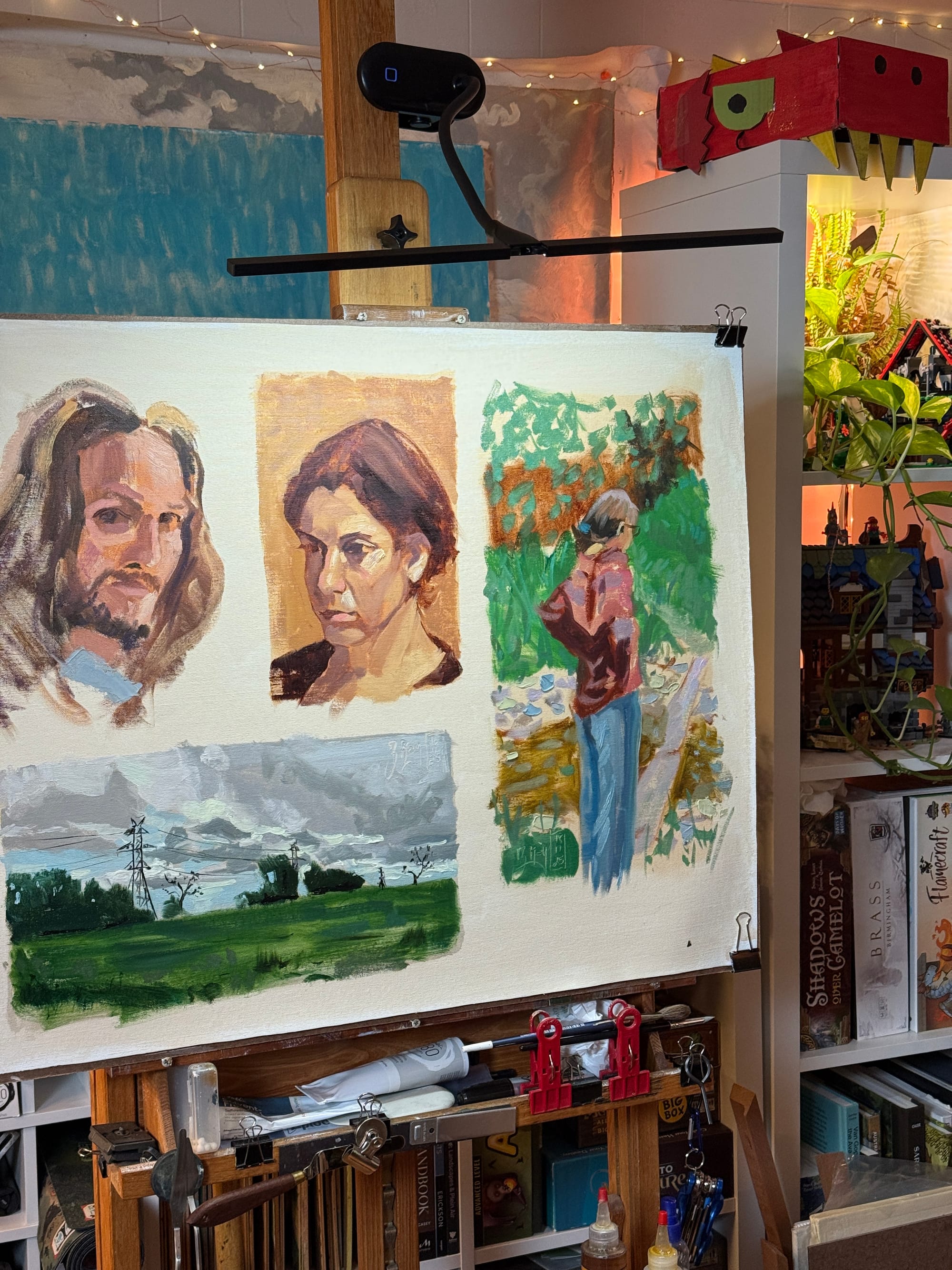 Sketches of yesterday’s painting, as well as the photo that inspired today’s painting, and today’s painting on the easel.