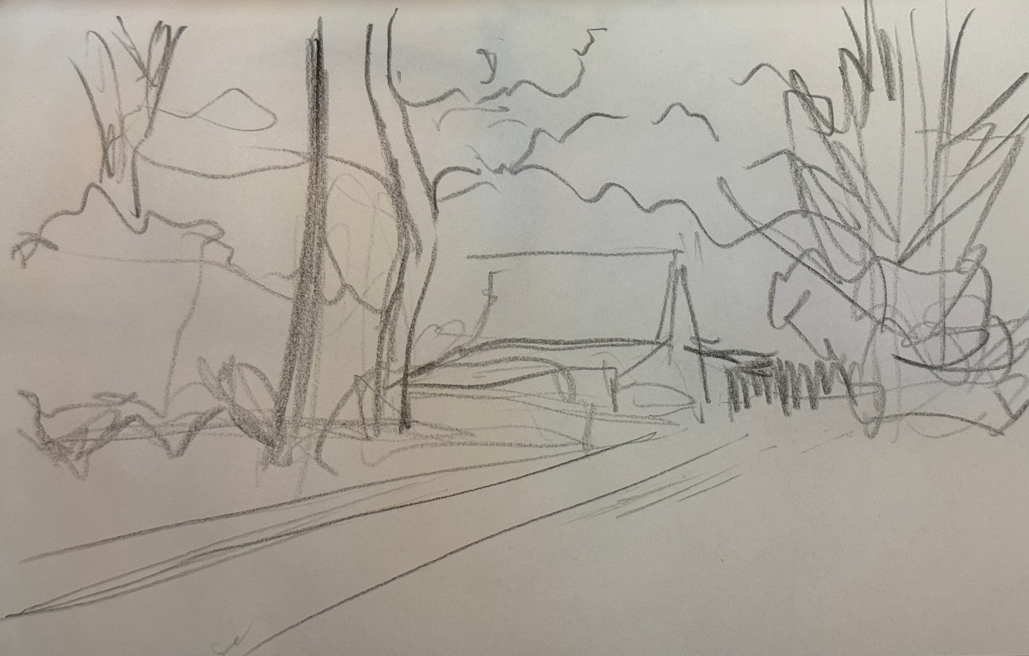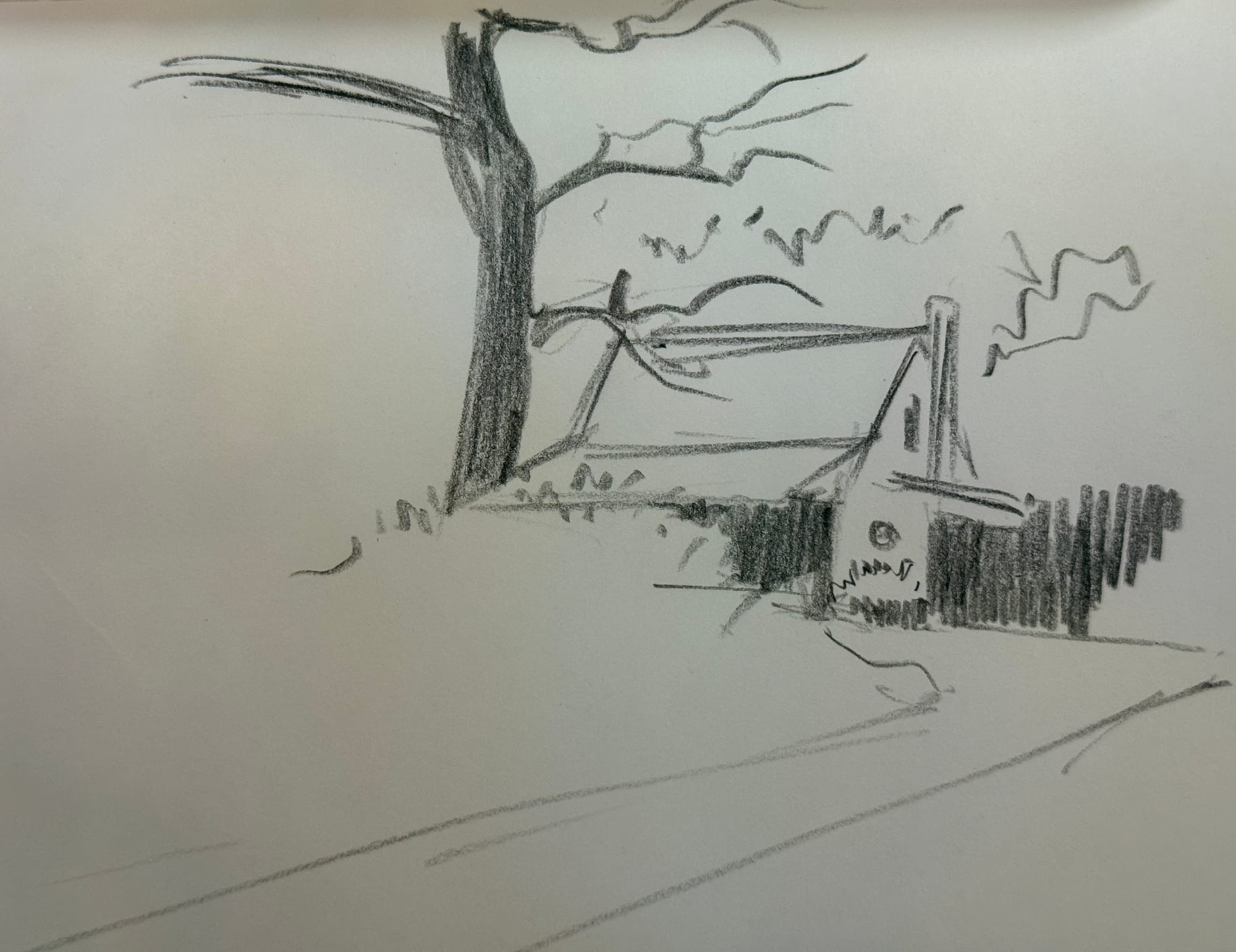 I also did a bit of sketchbook work, messing around with a different composition for yesterday’s painting, as well as a quick study of the house itself.