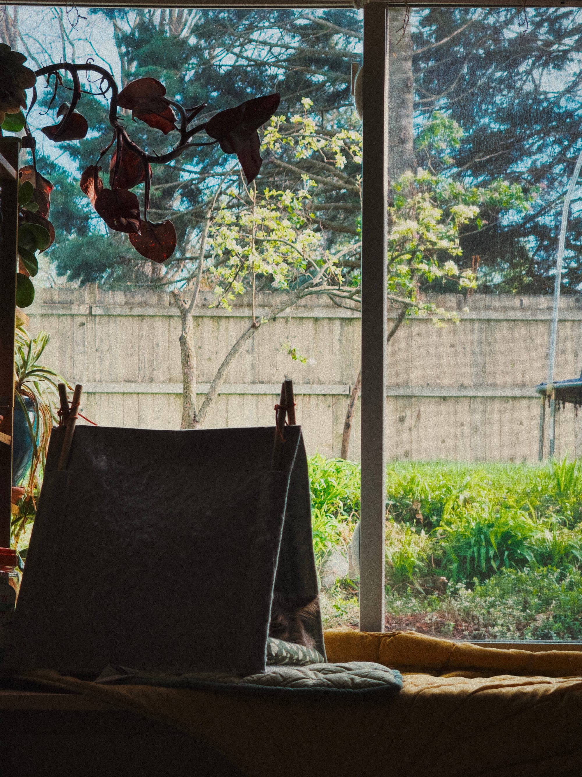 I did another quick sketch of one of the pear trees in the yard today - mostly because it was directly in line-of-sight this afternoon. I really love the "Y" shape the tree makes, and the graceful curves to the right each of the branches makes as they grow upwards. It's always a fun tree to draw and paint. The picture below shows my view of the scene this afternoon. As a bonus, you get Alva peering at you from around the corner of his tent in the window. This is his usual afternoon napping spot. That's his usual look of curious disdain for whatever it is I'm getting up to while he's napping.