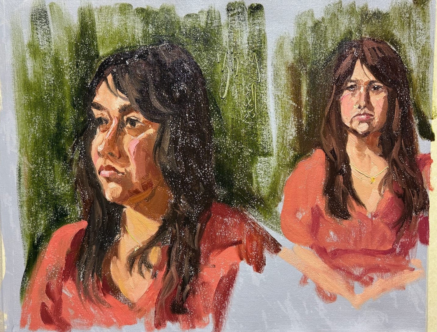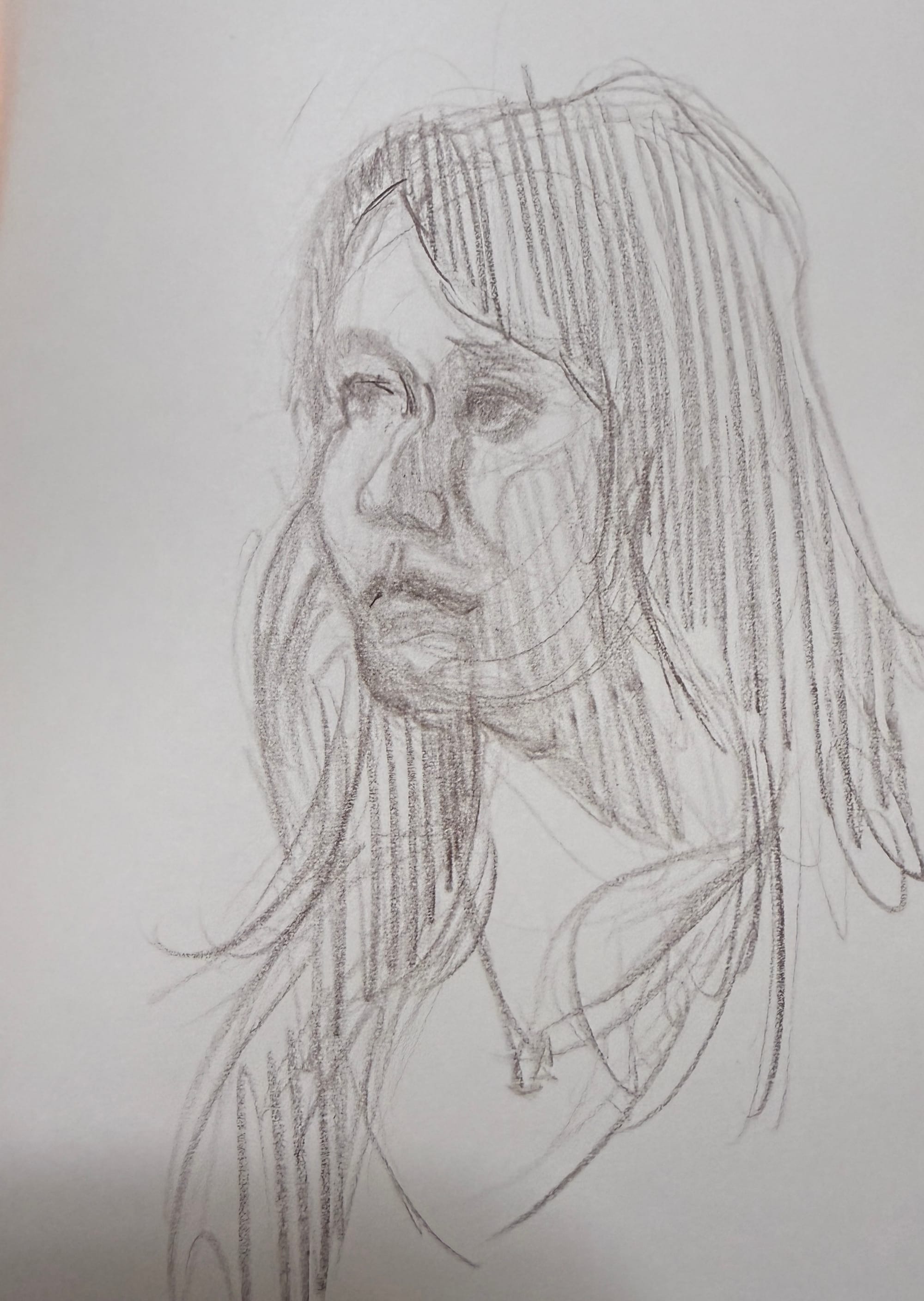 I went to my local portrait drawing class/session tonight. I started out with a quick sketch in the sketchbook, just to familiarize myself with the model. It’s a casual attempt to capture a likeness, but in a low-stakes way. If it doesn’t work out, hopefully I can identify my mistakes quickly and not make them in the painting.