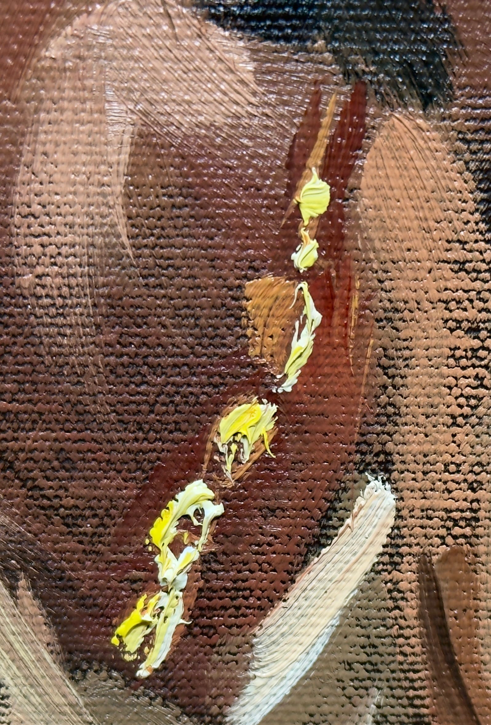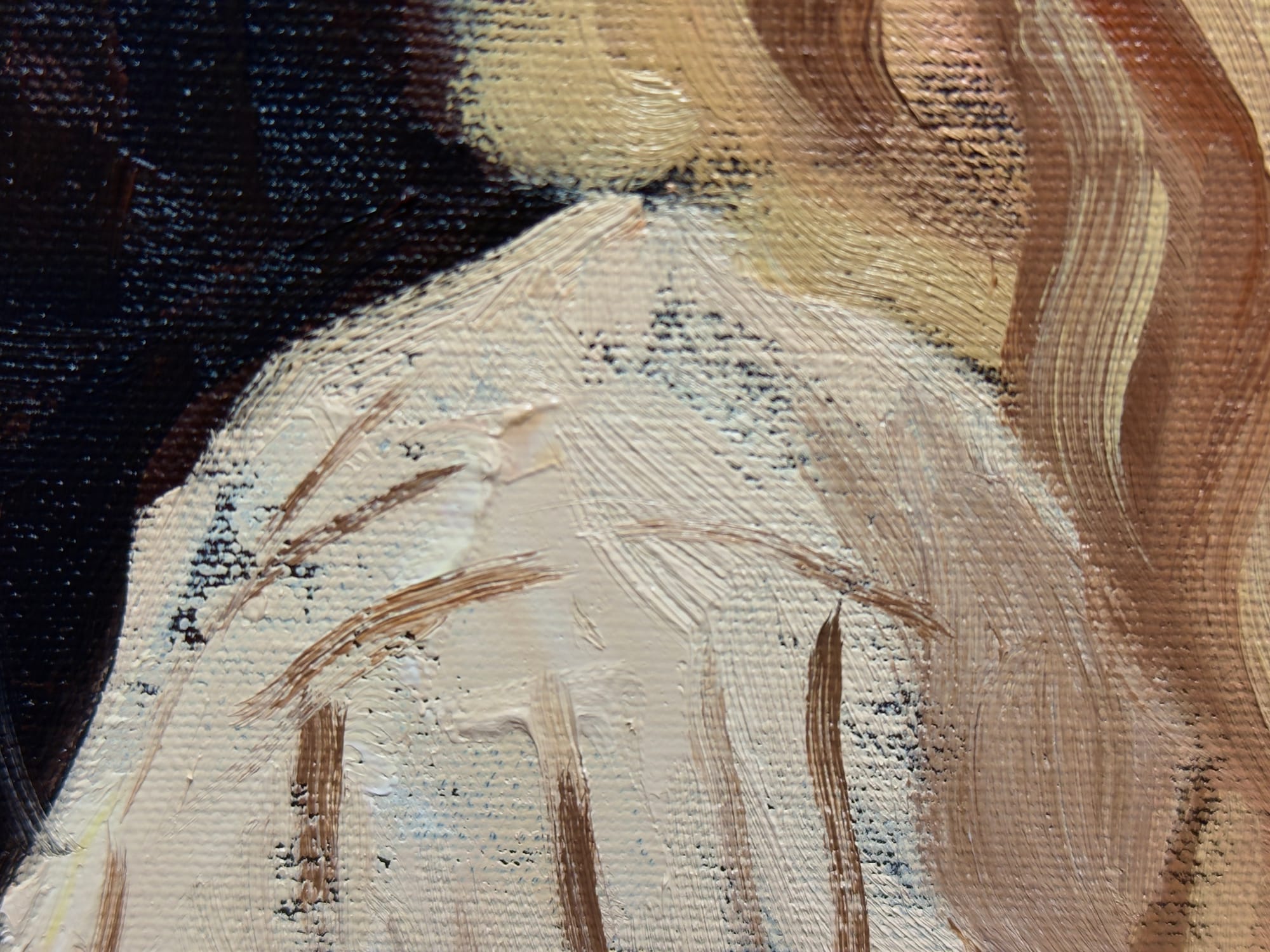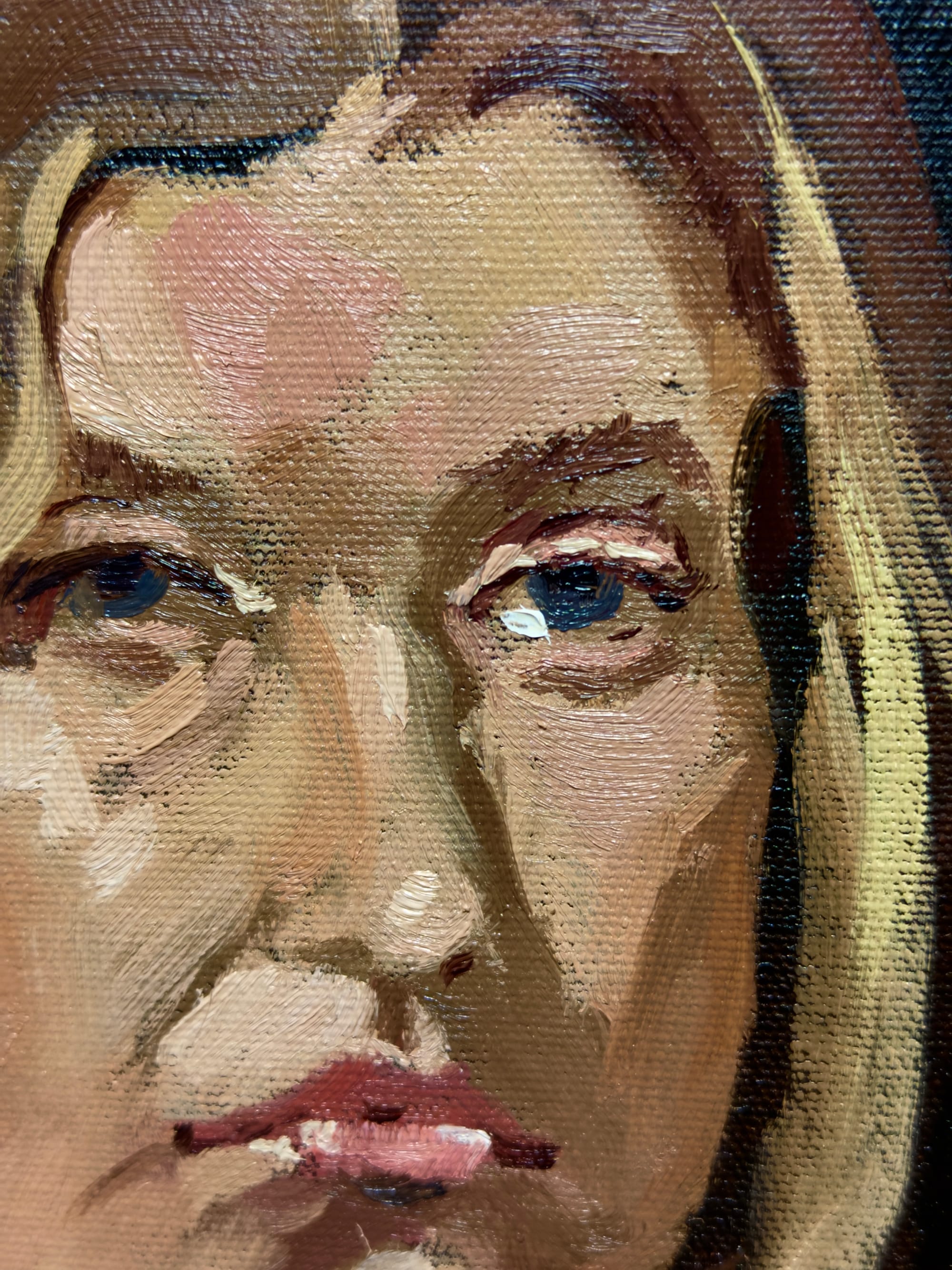 Some fun details. I love the highlight on her left eye, the palette knife work on the shoulder, and the impasto of the necklace.