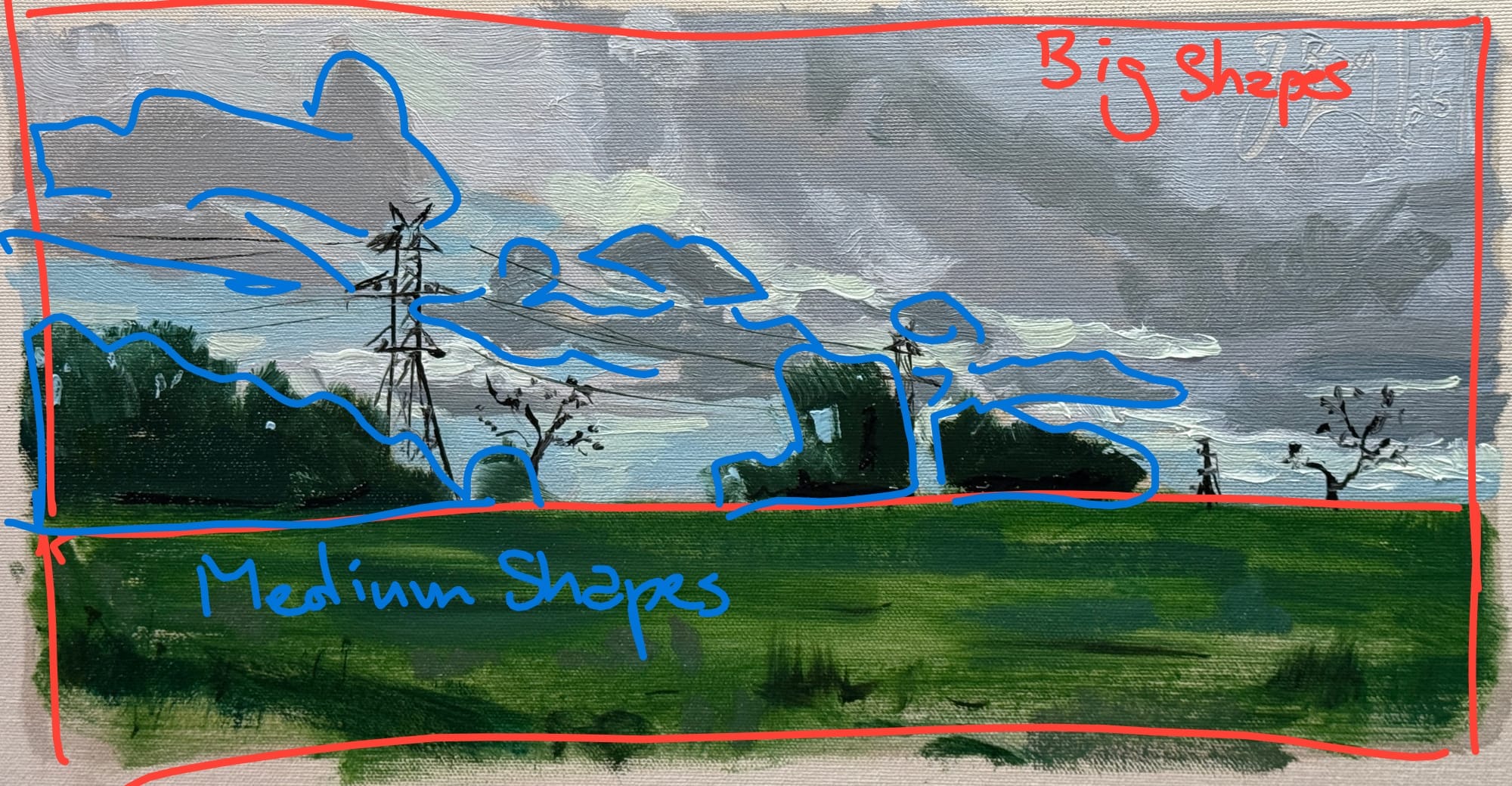 For this one, the big shapes are the sky and the field, and the grey wash behind them, the medium shapes are the dark-green tree line that separates them and the subtle(er) divisions within the clouds and sky, and the small shapes are the power poles and lines, as well as the few silhouetted bare trees. Next week will be more about the small shapes and finishing touches, so I wasn’t too careful with them this time.