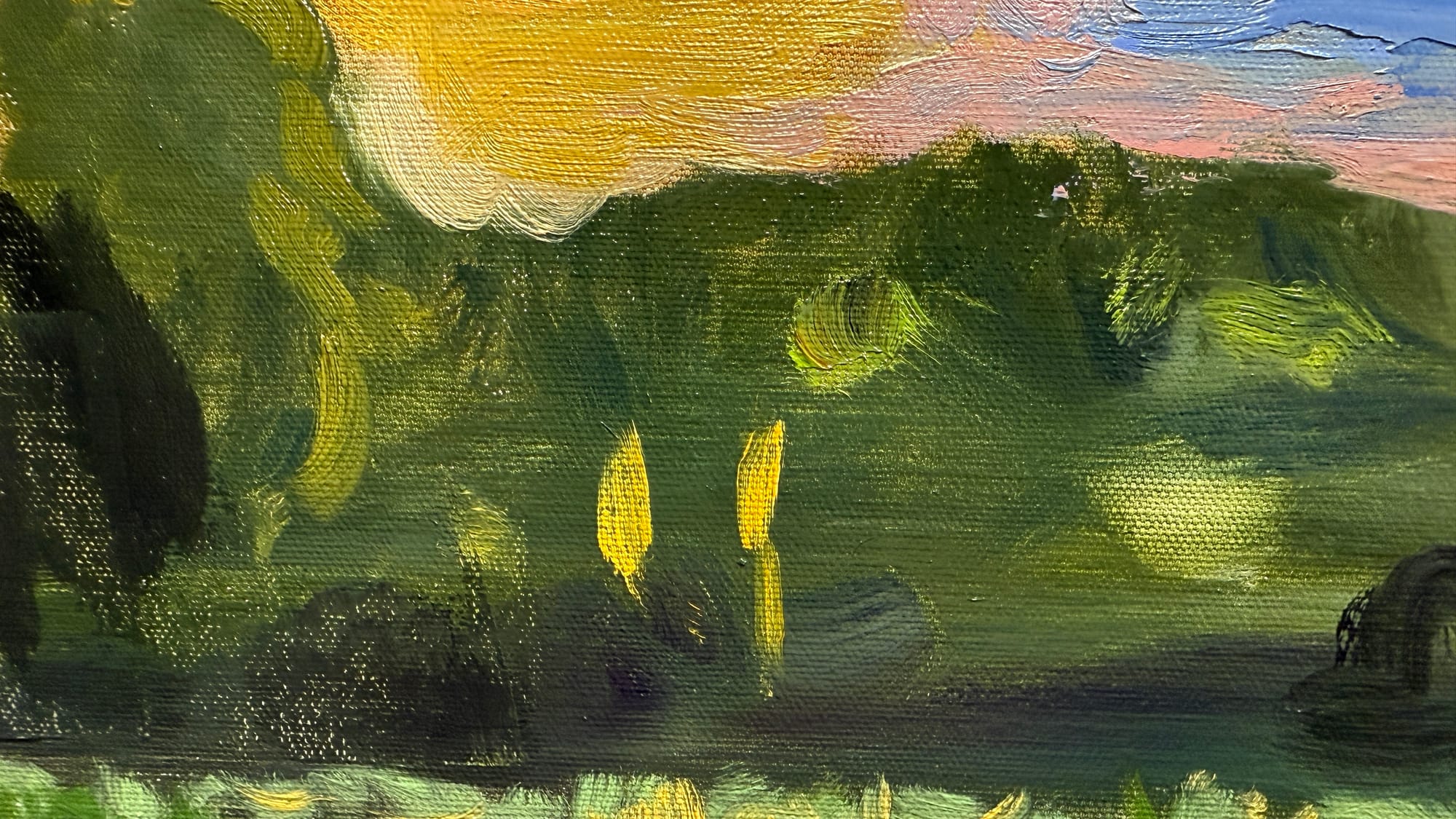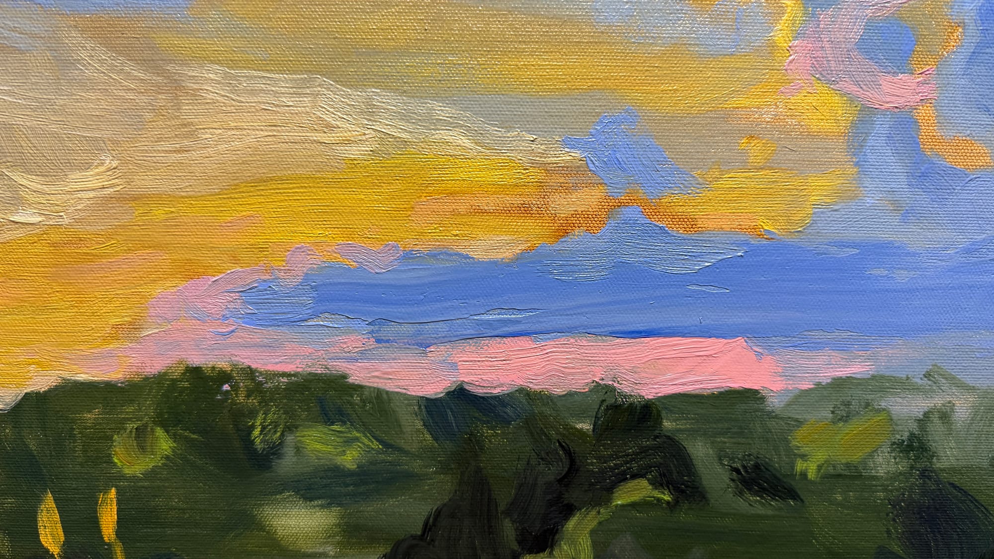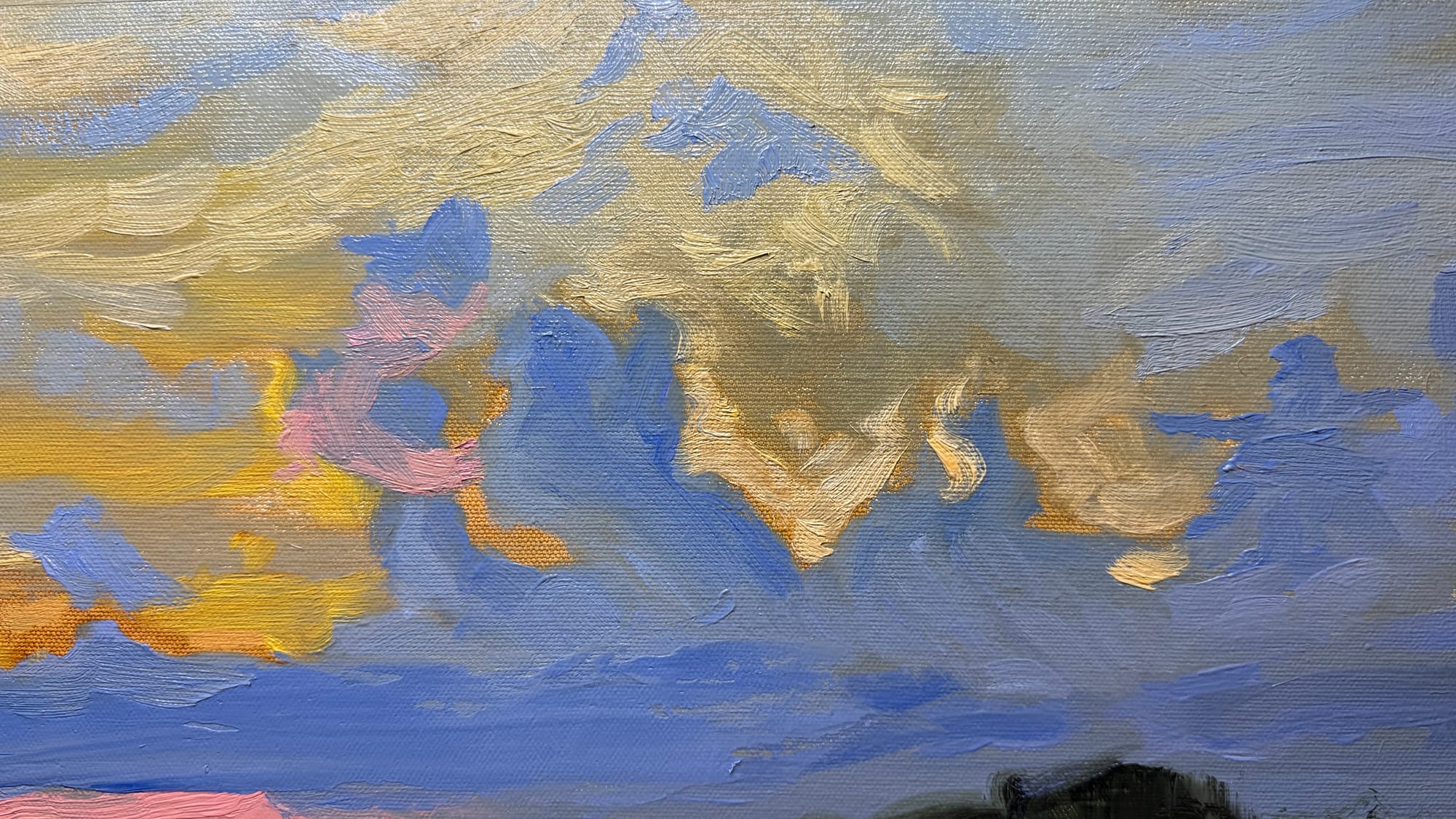 I had a chance to tidy up yesterday’s painting a bit today. I spent a fair bit of time working on the clouds, as they’re the main focus of the painting. I’m reasonably happy with them now. I think. The next step is to let the painting dry for a bit, and then I’d like to experiment with a dark green glaze of color over the lower portions of the painting. I could probably make the painting work in other ways, I just feel like it would be fun to do the glazing.