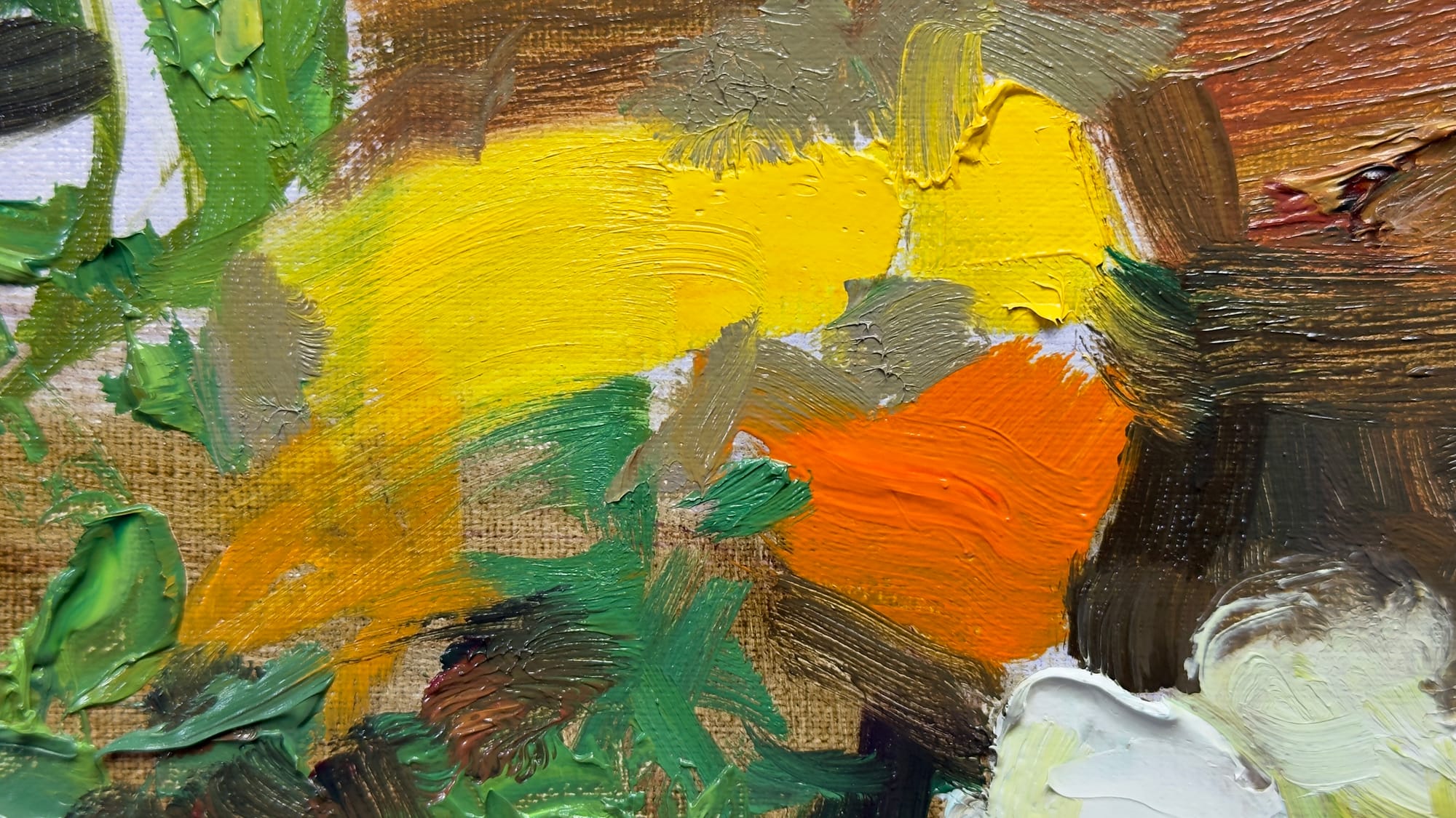 Thinner paint in the first picture, thicker paint applied with a palette knife in the second photo.