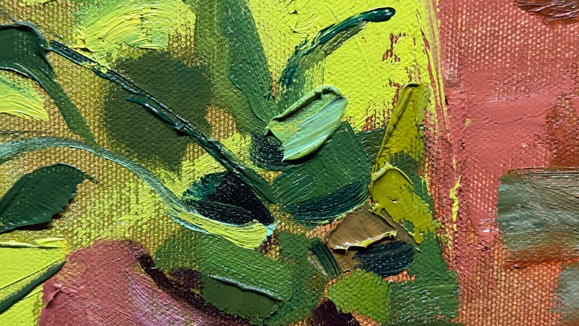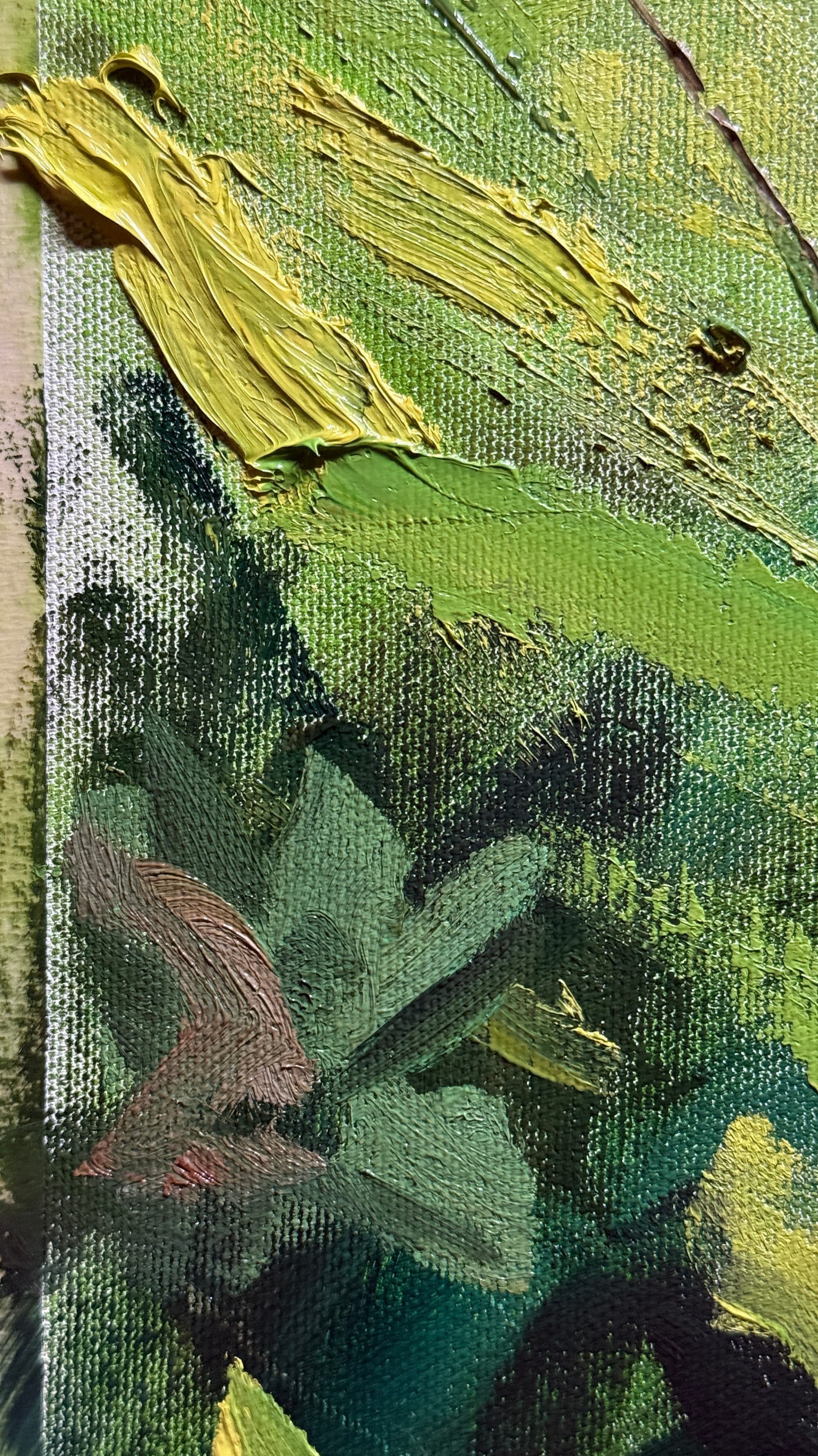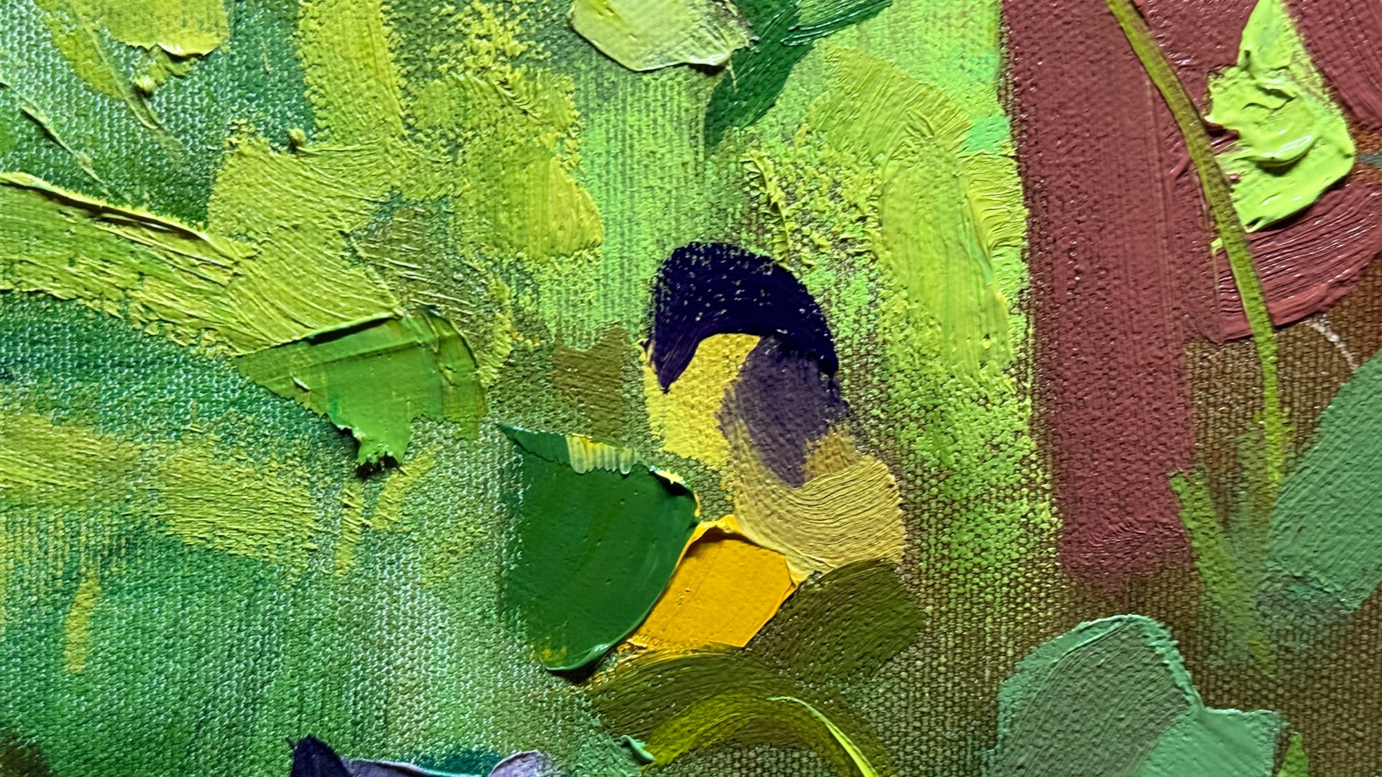 I got back to working on this painting of Violas from a few days back today. The painting session went fairly well, I think. I think I’d like to spend one more session with this painting, just to bring a few things to a bit more finish. I’d like to make sure the violas are as nice as I can make them, and paint in a bit more leafy-grassy-goodness in the bottom. Those lovely darks could stand to have a few more leaves and grass stalks layered in on top of them. Overall, the structure of the painting got sorted out very well in the first session, and this second session was more about sorting out the details. The third session should just be to dot the i’s and cross the t’s, so to speak.