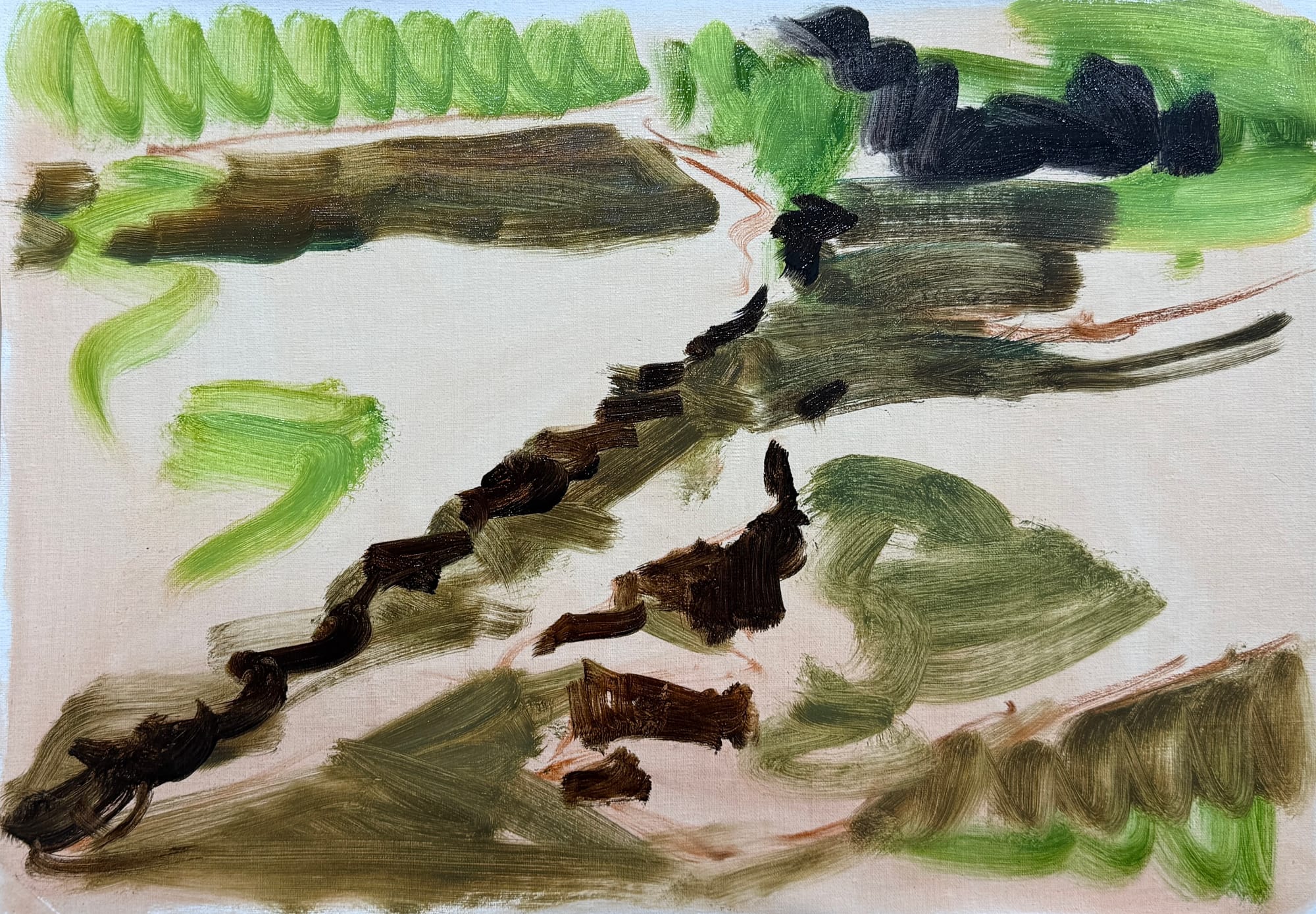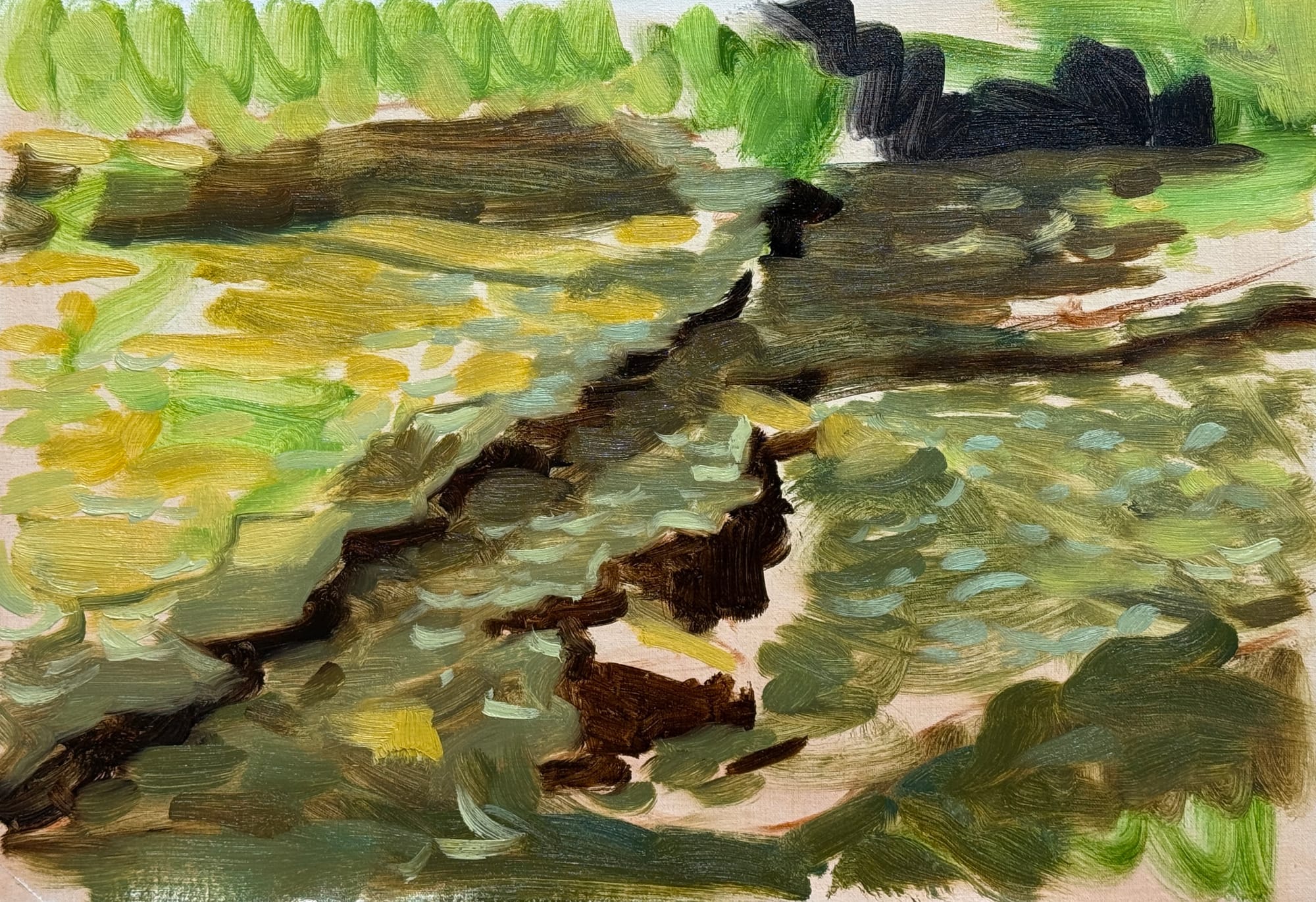 Today I started on a block-in for a painting of a waterfall. Sometimes it’s fun to hold back on one element of a painting (in this case the white water) until other areas of the painting are blocked in. It’s kinda fun to see the progression towards this. To that end, I’m gonna add the progress pictures again below. Perhaps I can push this one a bit further on Wednesday as well.