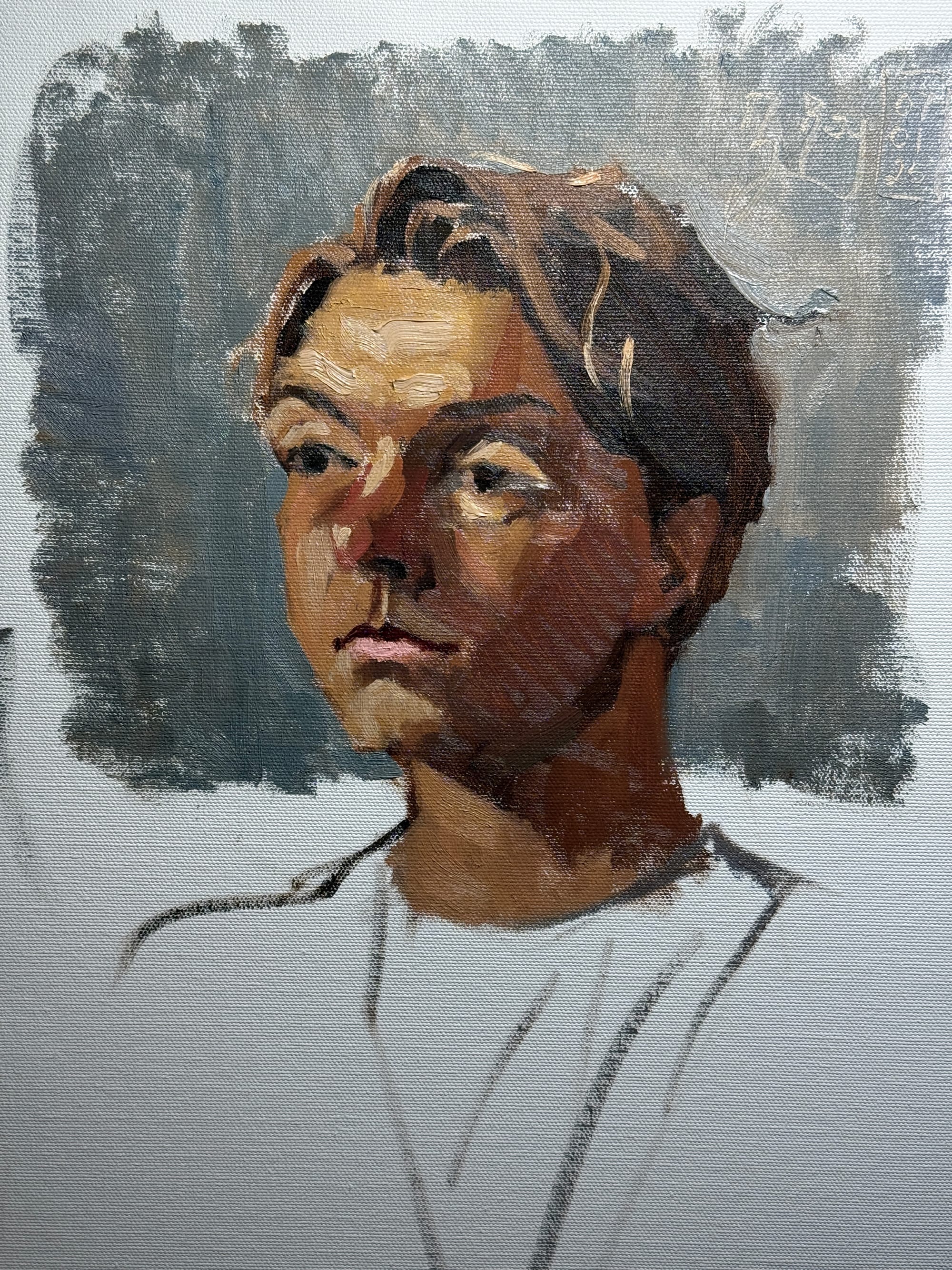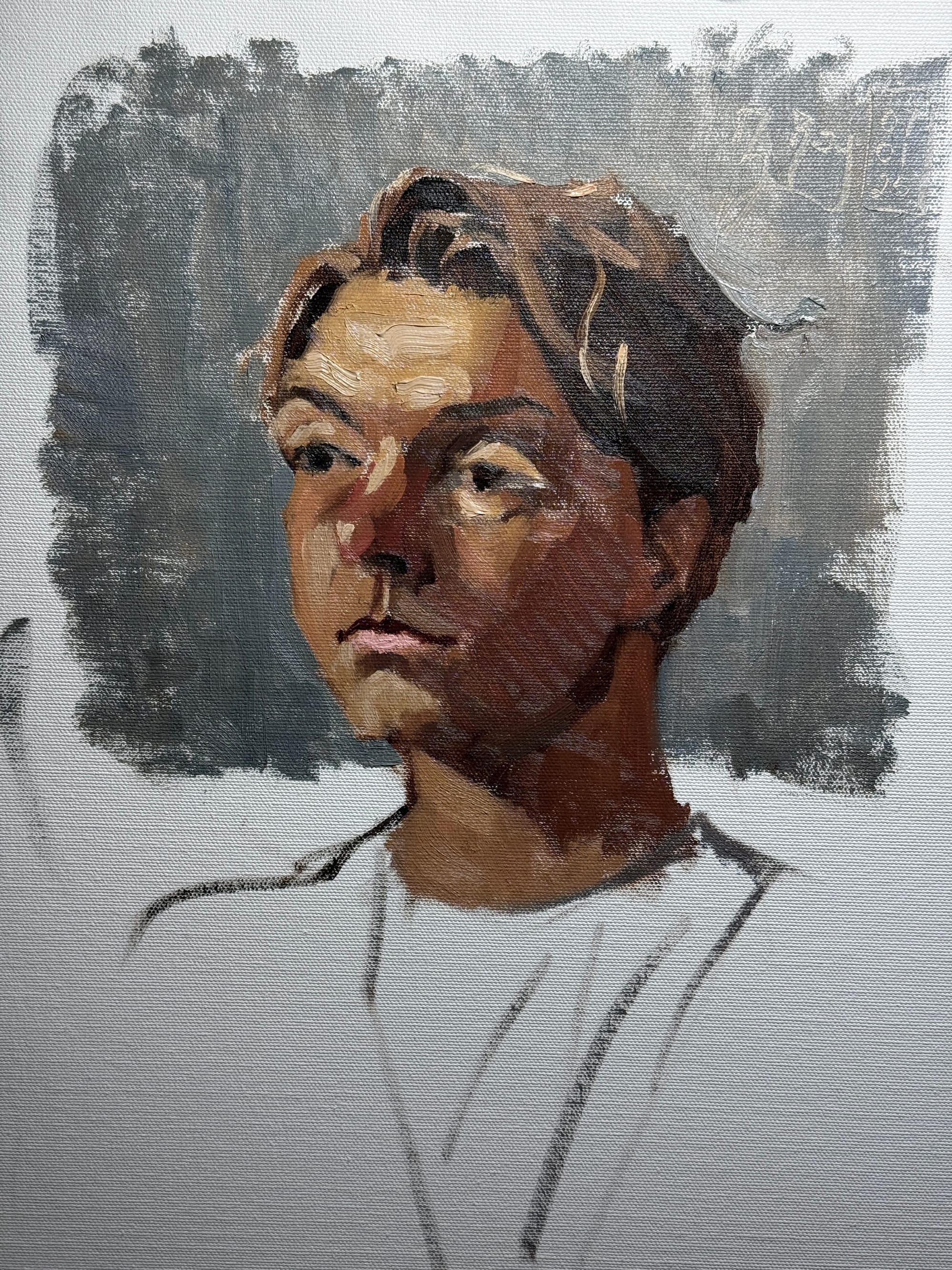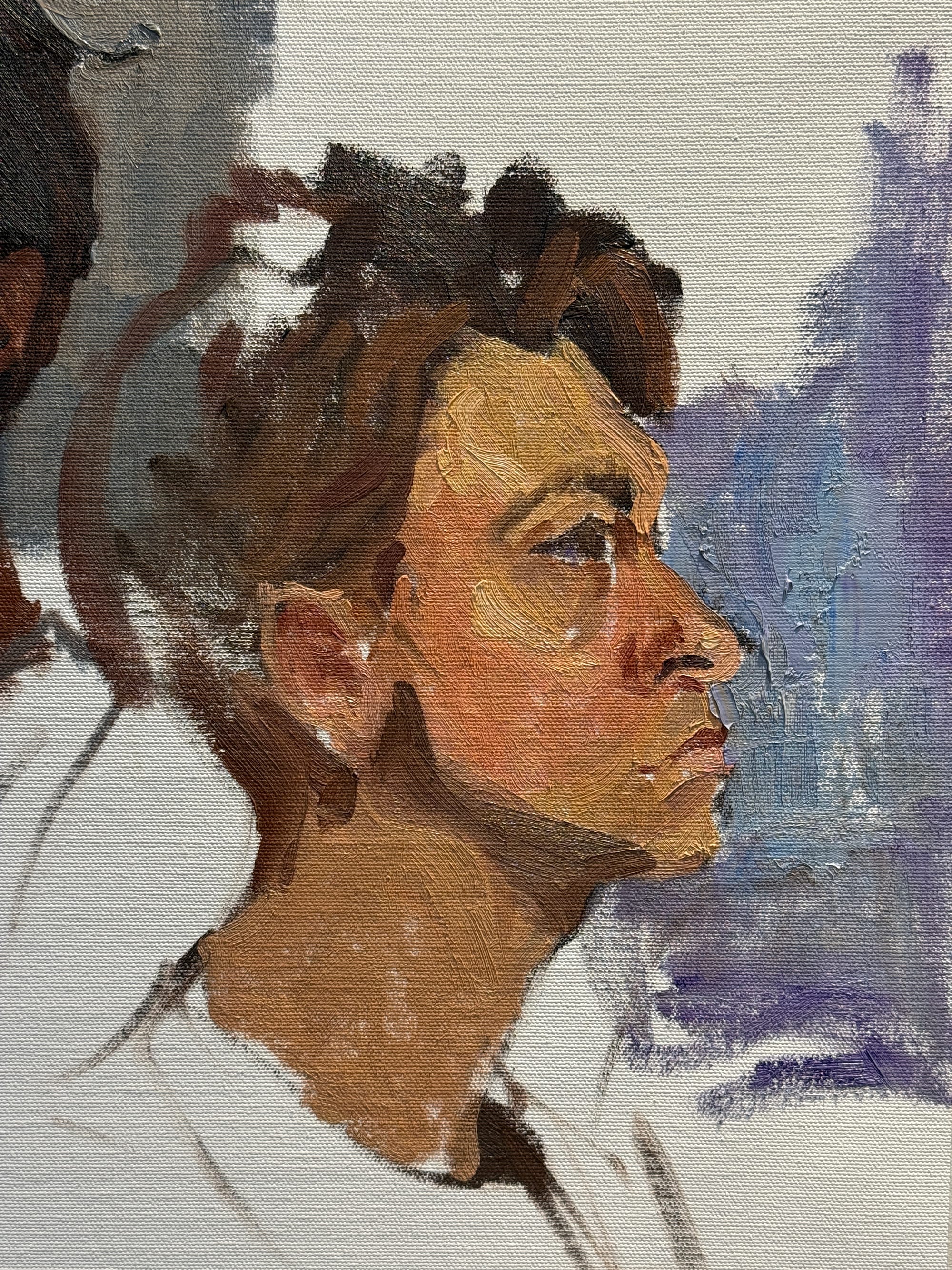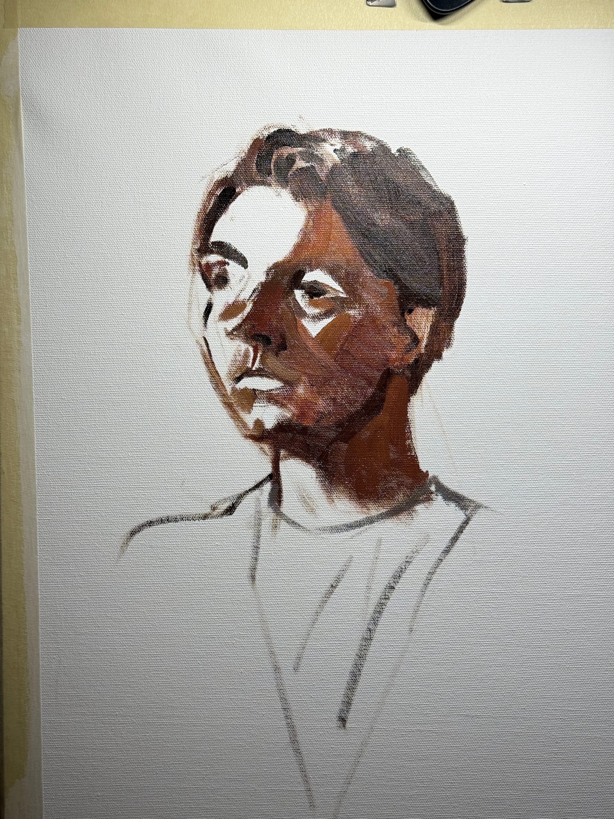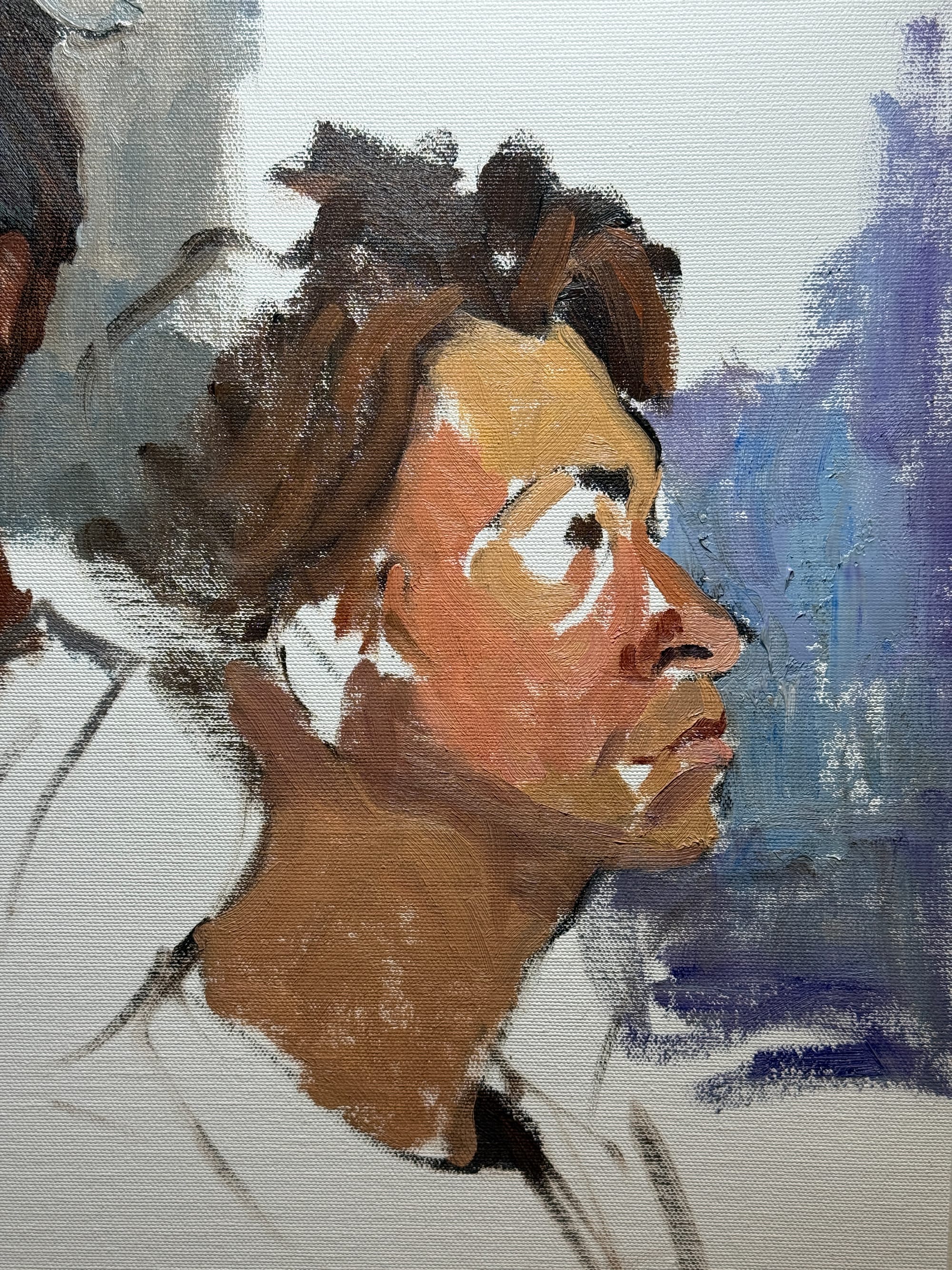I got to go to the Wednesday night portrait session at The Box Factory again tonight - second time in a few months! I realized halfway to class that I'd forgotten any sort of painting medium... Typical. I remembered everything but that one tiny thing. Fortunately, medium isn't required to make a painting, and I resolved to paint with the paint just as it came from the tube. I was pleasantly surprised at the results, as I haven't done this in quite a while! I got through a portrait pretty quickly, and relocated to do another quick profile sketch of our model. All said, things didn't go as nearly as poor as they could have, and I had a lovely time getting back into the portrait painting groove tonight!