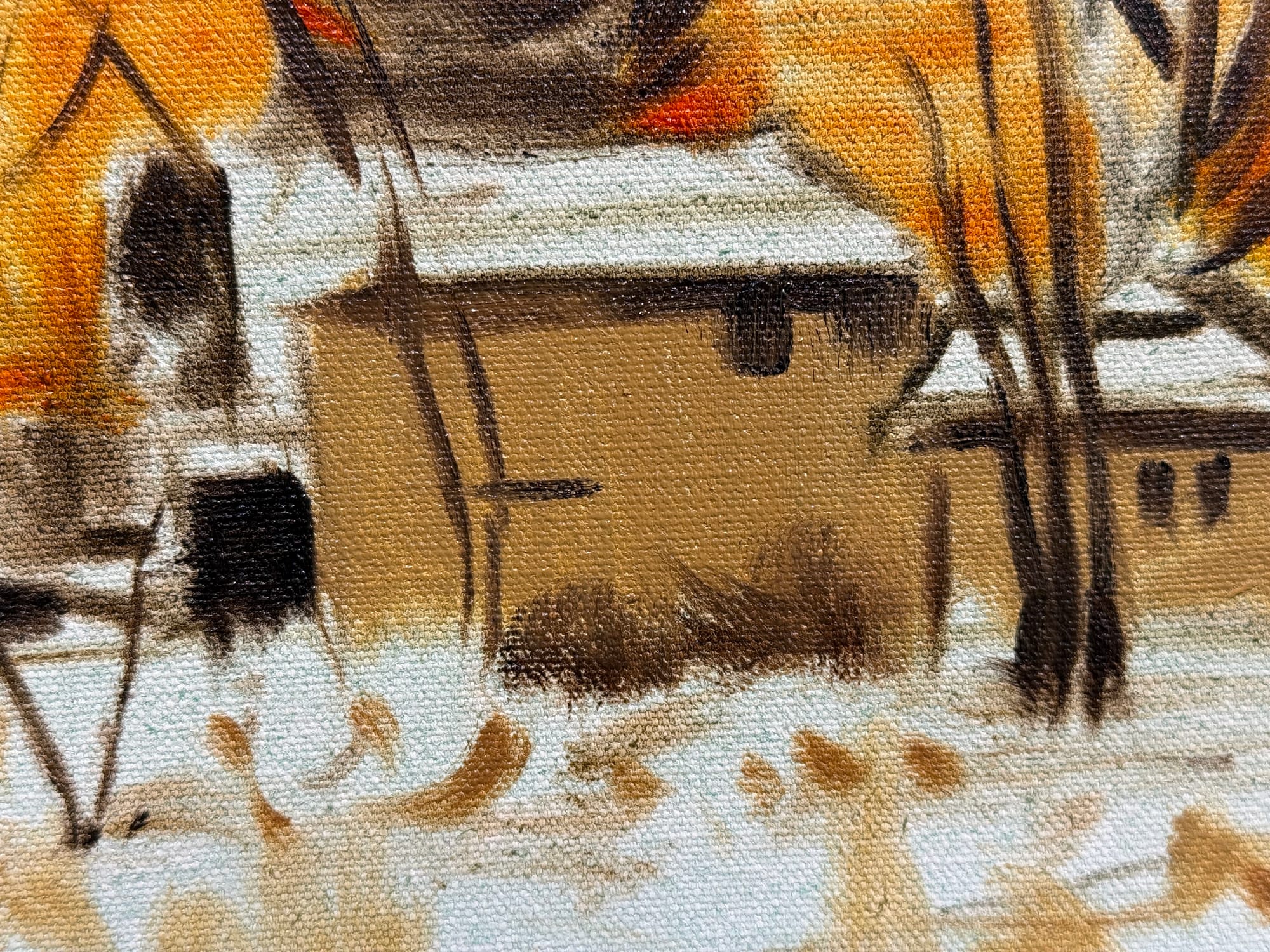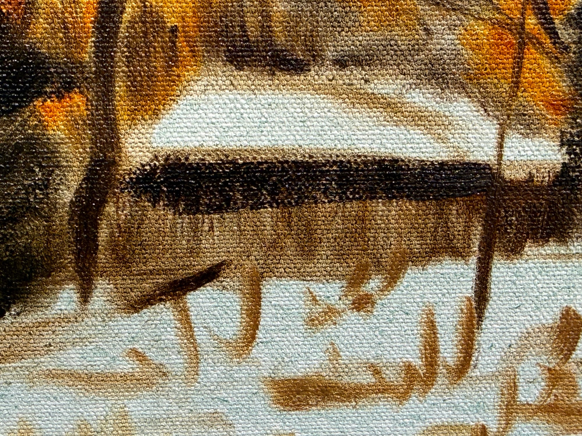 I got to start something new! Full of promise and not full of portraits! I'm so excited. The beginning of a painting is always so much fun. In honor of getting to work on a new painting after forcing myself to finish portraits, I started out with straight up vibes this time. I just started out on a large scrap of canvas with a blue color field. Then I started adding the dark accents and the warm orange band of distant trees. I think this is a good place to have left the block-in for today. Everything is still really thin - paint-wise. Next session I'll start adding thicker paint, and really get into the painting. Until then, here's a few details of the houses and the reference photo.